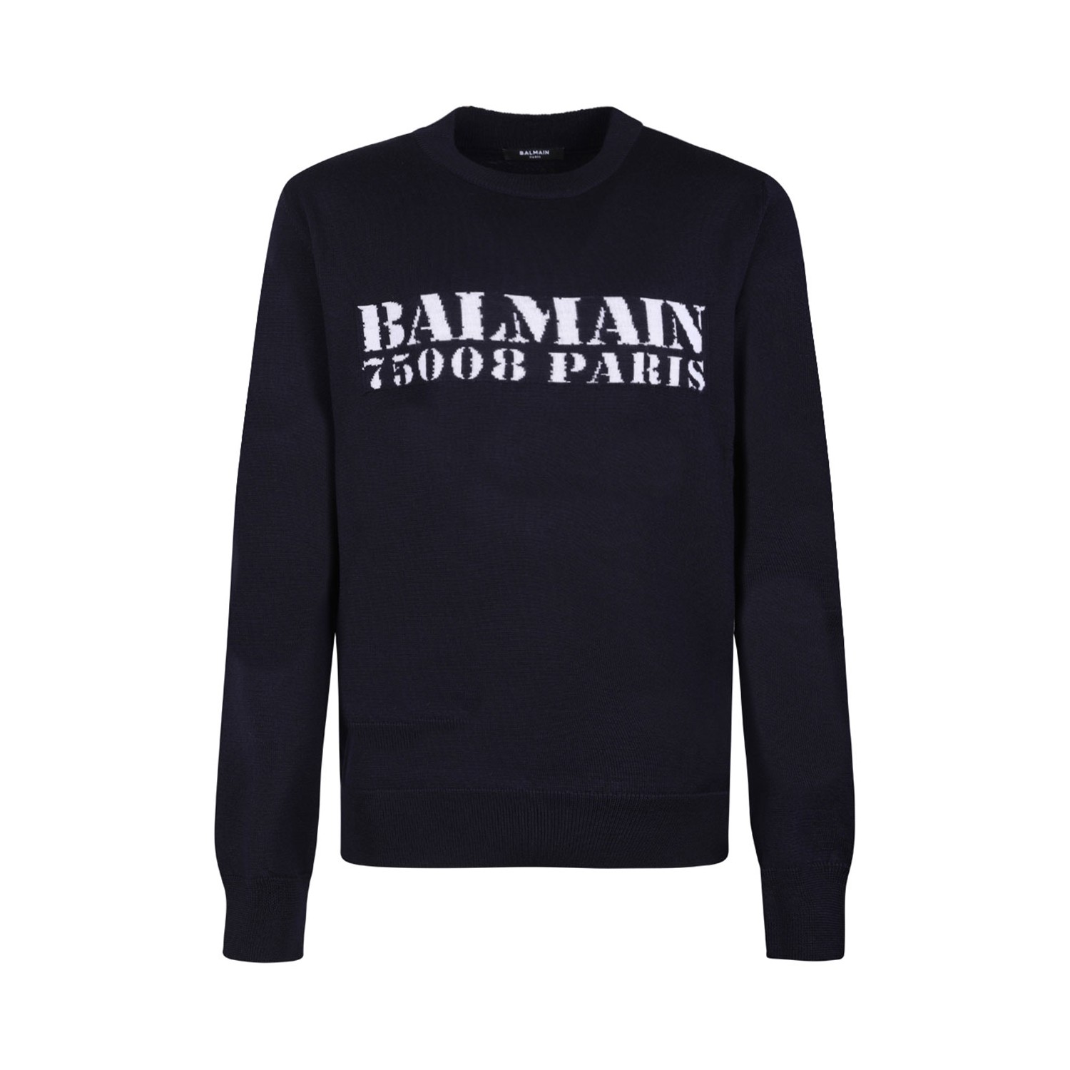 Balmain Navy Blue Logo Intarsia Knit Jumper. Navy blue knitted construction jumper with logo intarsia to the front, round neck, long sleeves and straight hem.