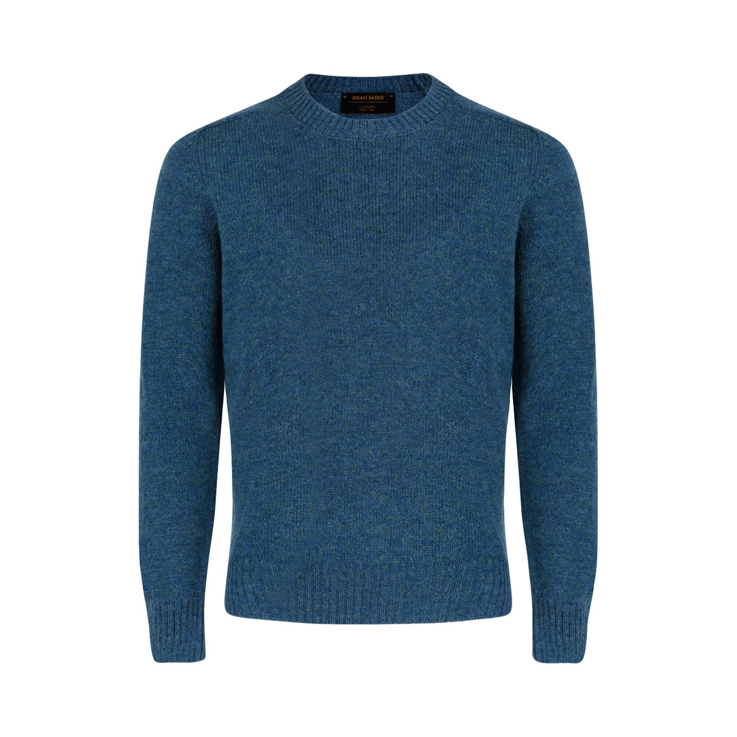 Gran Sasso Blue Wool Sweater. Blue crewneck sweater made from pure Shetland wool, known for its natural durability, slightly rustic texture, and exceptional warmth. This type of wool, sourced from the Shetland Islands in Scotland, is prized for its ability to insulate from the cold while maintaining good breathability. The result is a garment with an authentic and robust character, ideal for those seeking a classic style with a strong material identity. Perfect worn alone or paired with winter jackets for a casual yet sophisticated look.