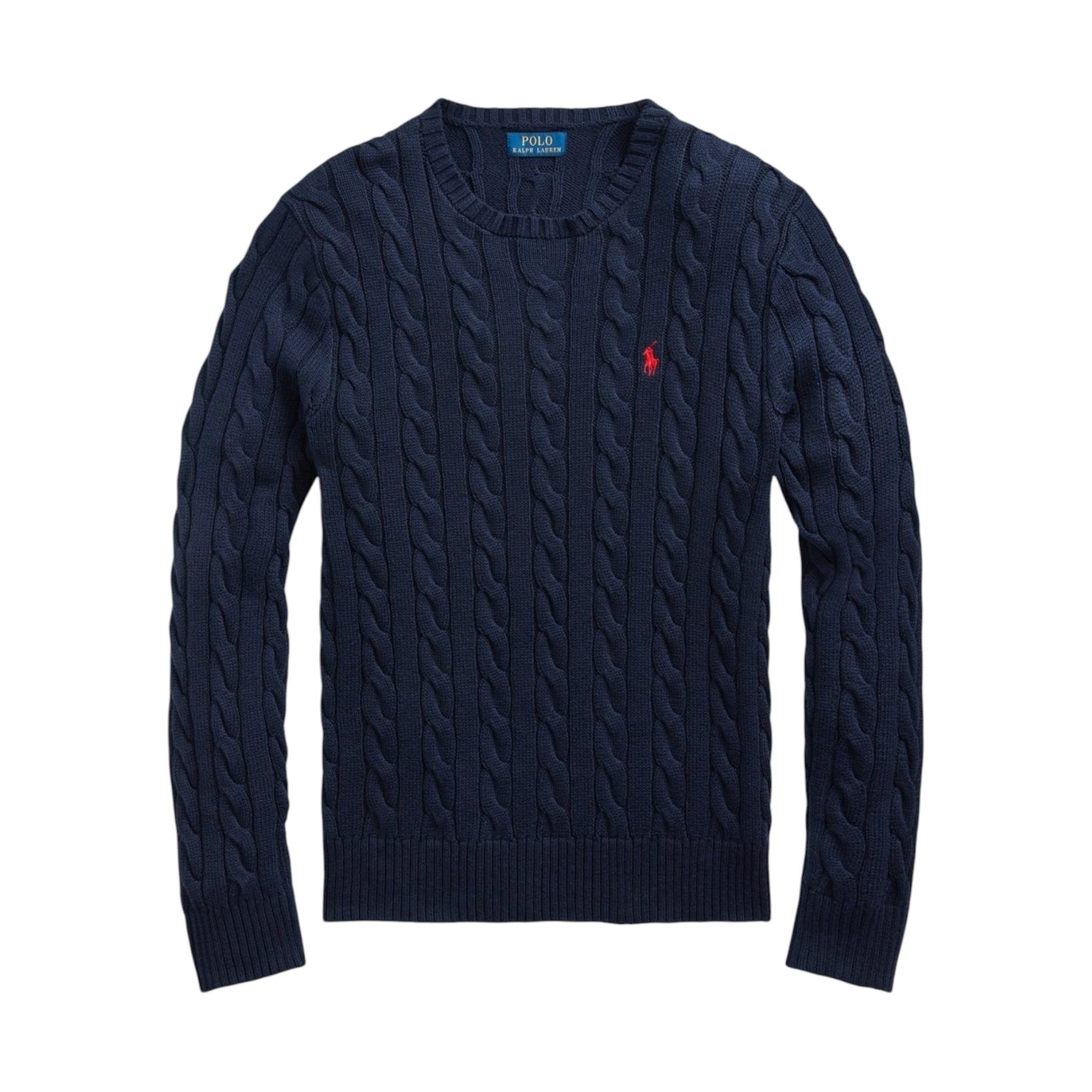 Polo Ralph Lauren Hunter Navy Cable Knit Cotton Sweater. Hunter navy cotton cable knit sweater with red logo embroidered to the front.