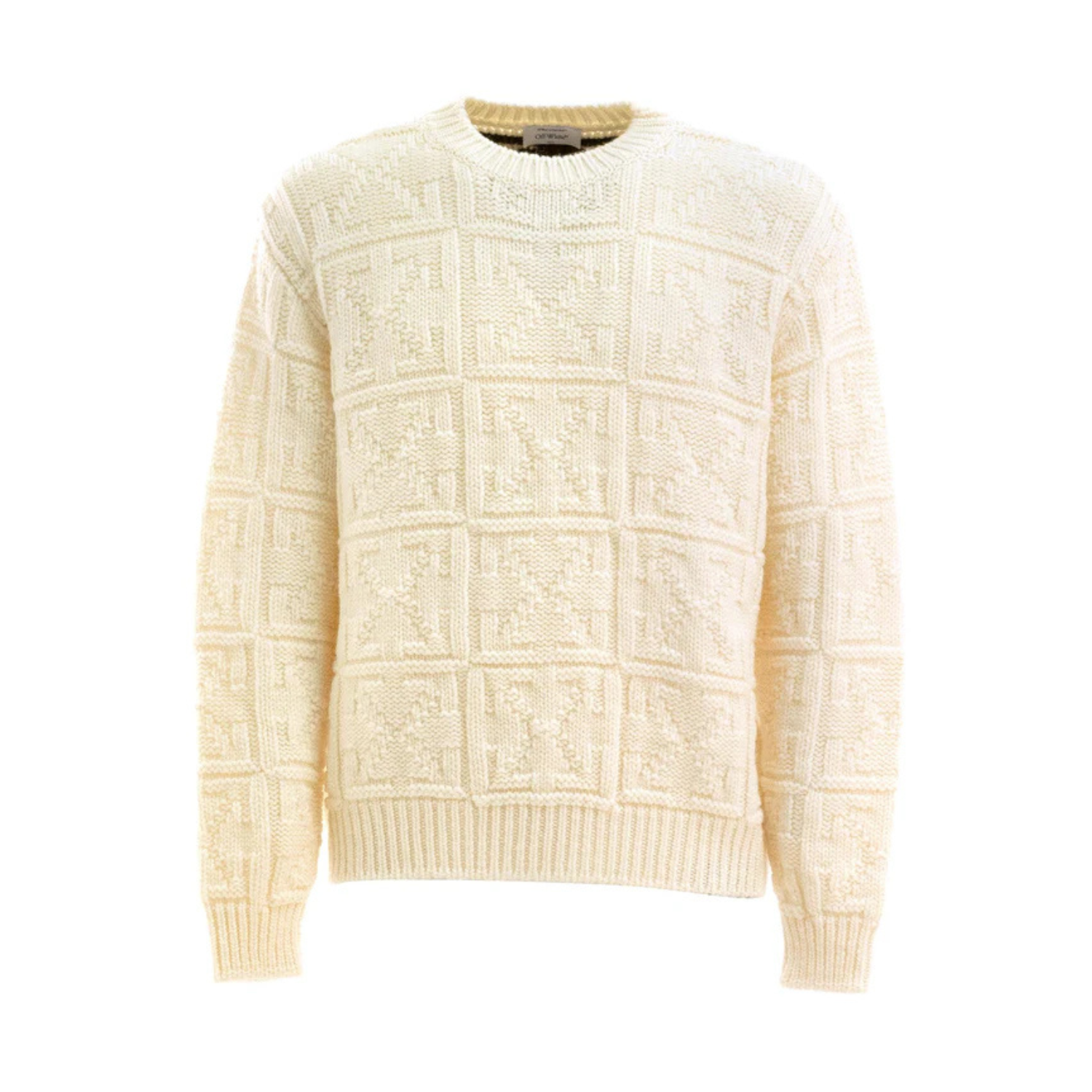 Off White Ivory Wool Sweater. Ivory wool sweater with an all-over Arrow inlay, featuring a crew neck, long sleeves, and ribbed edges. A contrasting Arrow detail on the back completes the design.