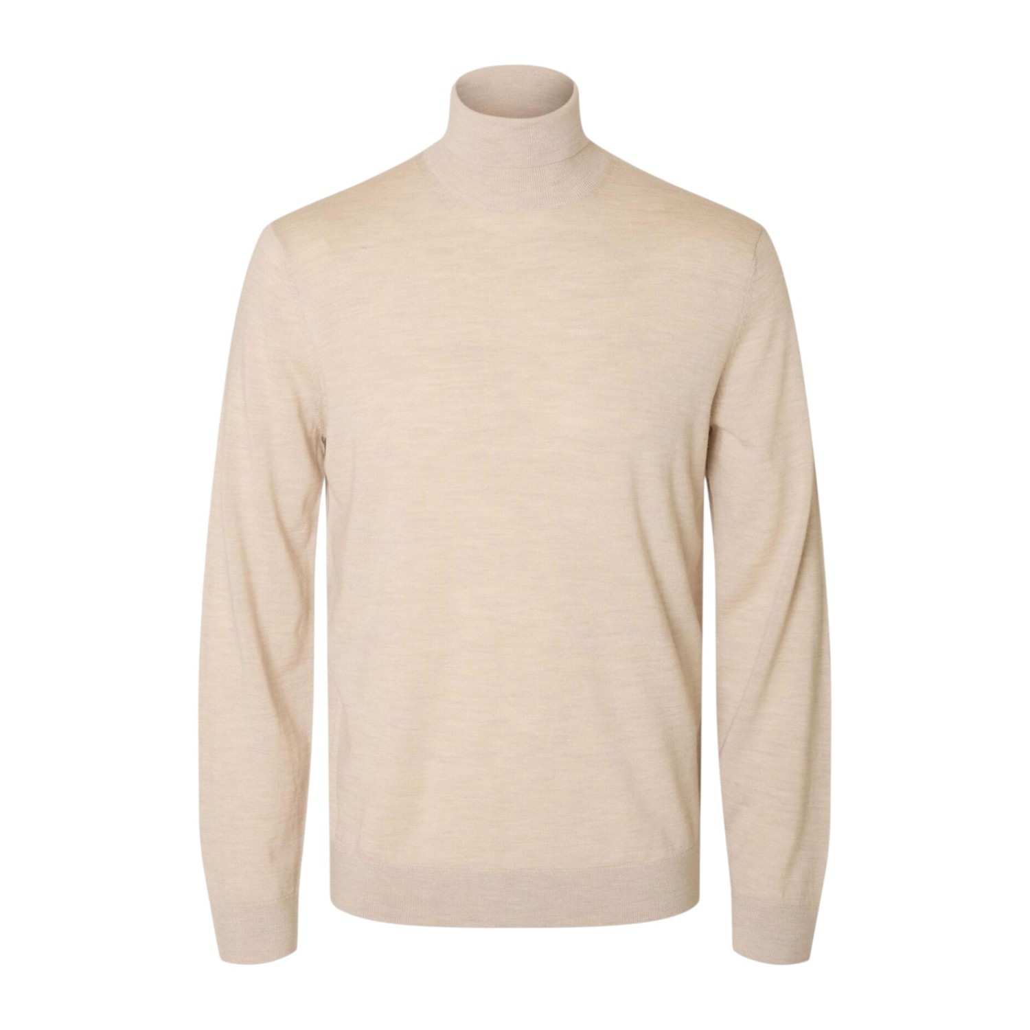 Selected Oatmeal High Neck Jumper. Oatmeal merino wool jumper, fitted turtleneck, long sleeves, ribbed trims.