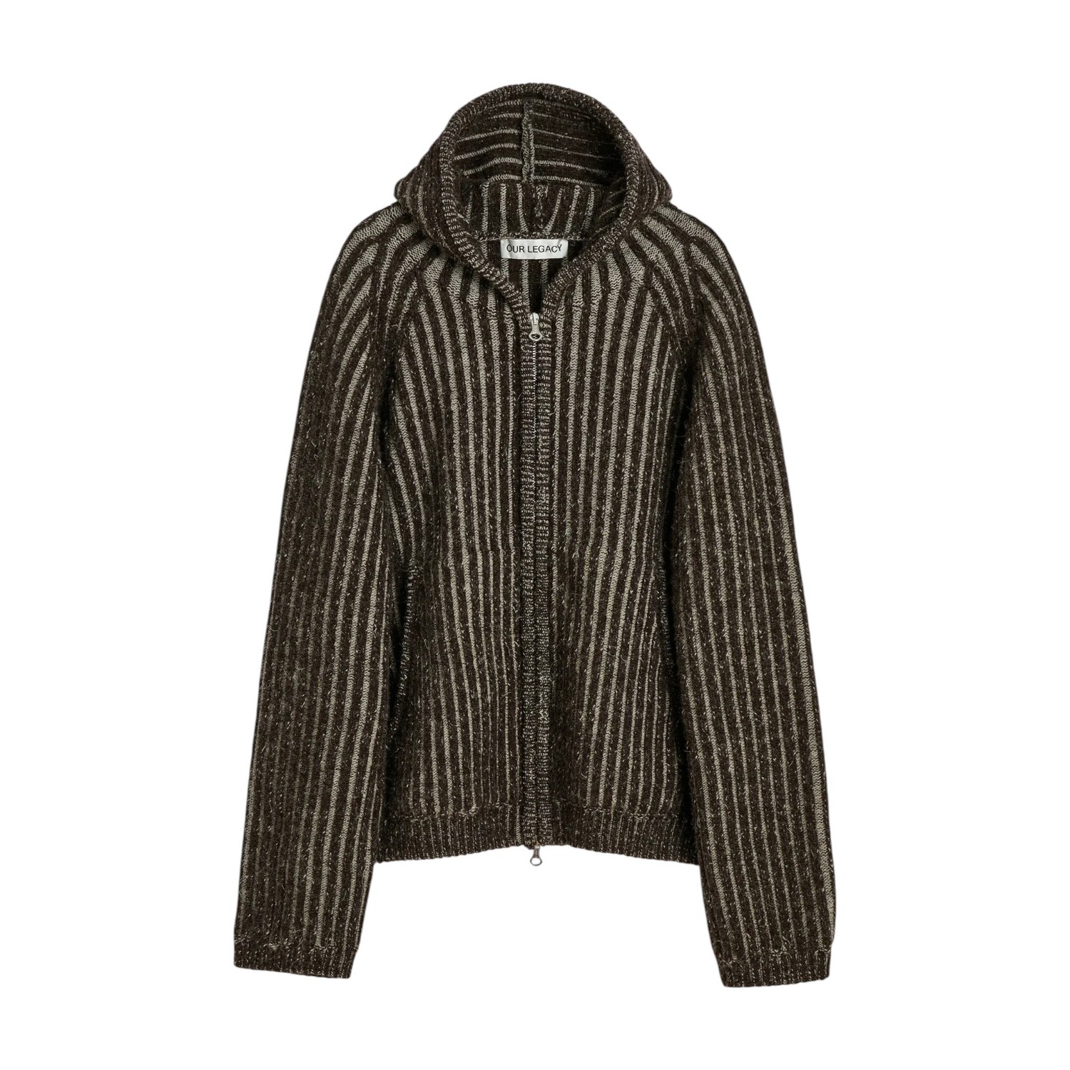 Our Legacy Vanise Brown Stripe Isels Wool Hoodie. Vanise brown English yarn hoodie with two tone 2x2 rib knit, raglan sleeves, two way zip. Patch pocket, ribbed cuffs and hem and straight hem.
