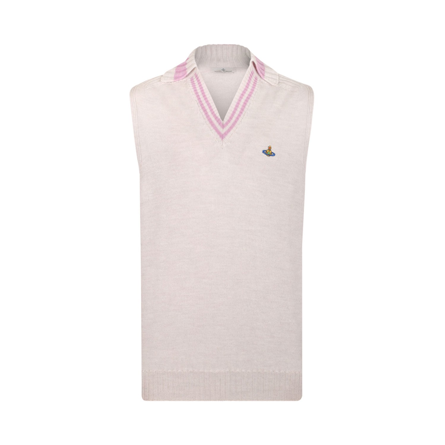 Vivienne Westwood Grey Melange Wool Fisherman Vest. Grey melange soft wool Fisherman vest with sleeveless, classic silhouette, fine mesh. Lightweight design, embroidered Orb motif, contrasting details on the collar, relaxed fit with ribbed waist.