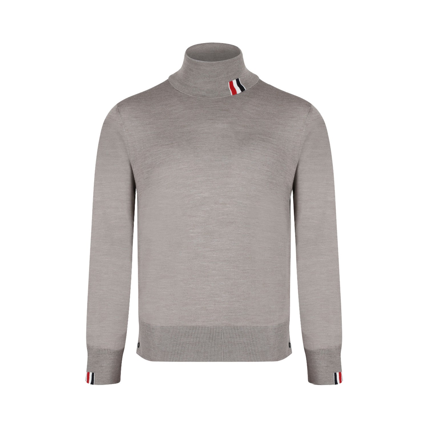 Thom Browne Beige Fine Knit Jumper. Beige virgin wool blend jumper, roll neck, signature 4-Bar stripe, long sleeves and straight hem.