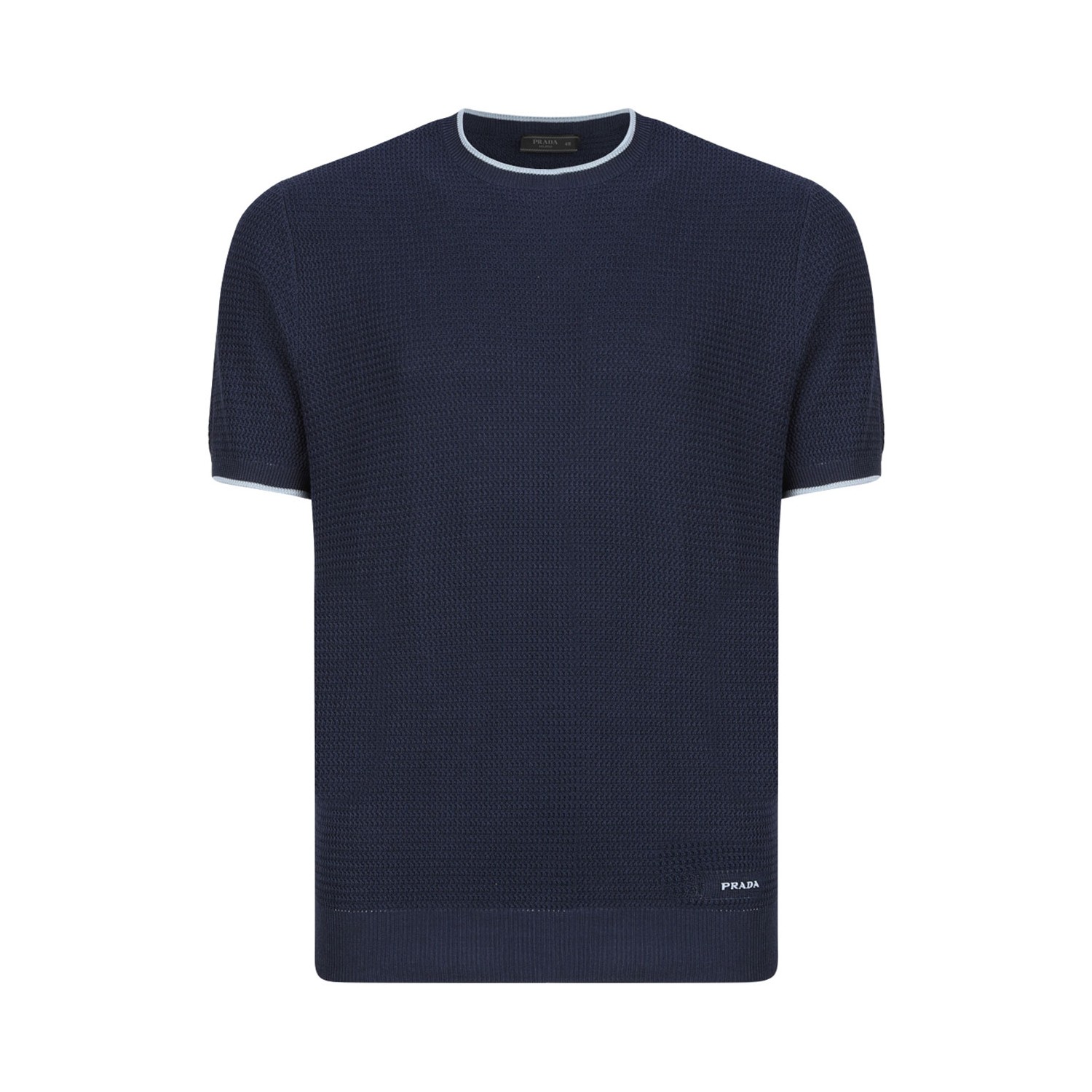 Prada Navy Blue Logo Embroidered T-Shirt. Navy blue silk and cotton t-shirt with crew neck, ribbed edge. Contrasting border and embroidered logo to the side.