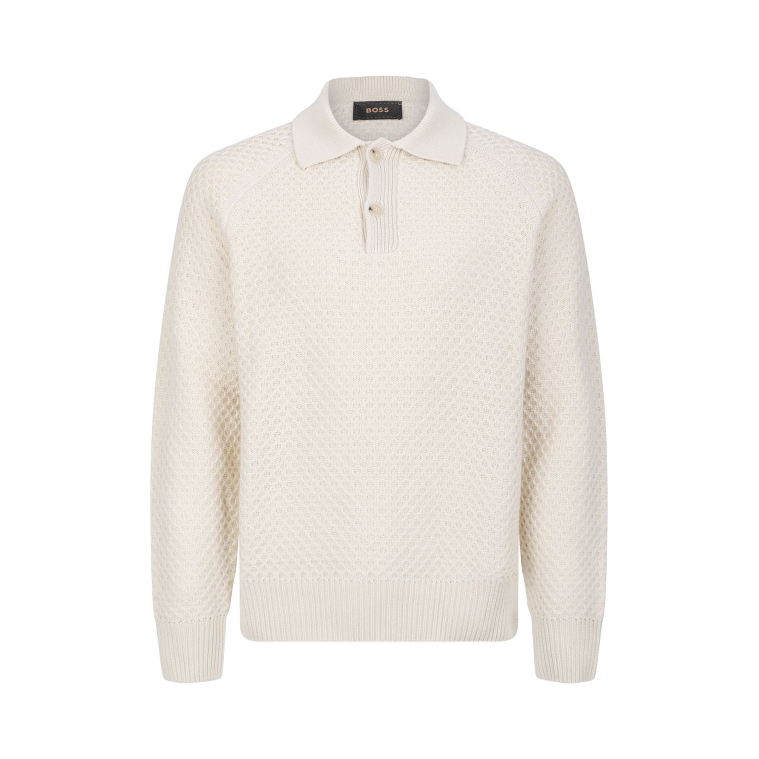 Boss Camel Neutral Color Relaxed Fit Knitted Cashmere Sweater With Polo Collar. Neutral color cashmere knit sweater with polo collar, long sleeve, ribbed cuffs and standard length.