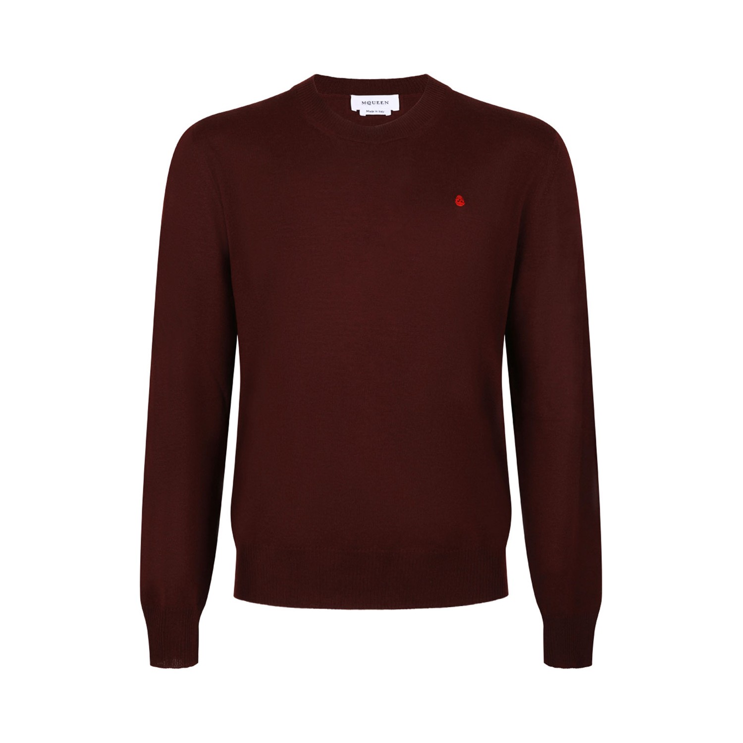 Alexander McQueen Oxblood and Fiery Red Logo-Embroidered Sweater. Oxblood and fiery red wool sweater with embroidered logo, round neck, long sleeves, ribbed hem and cuffs.