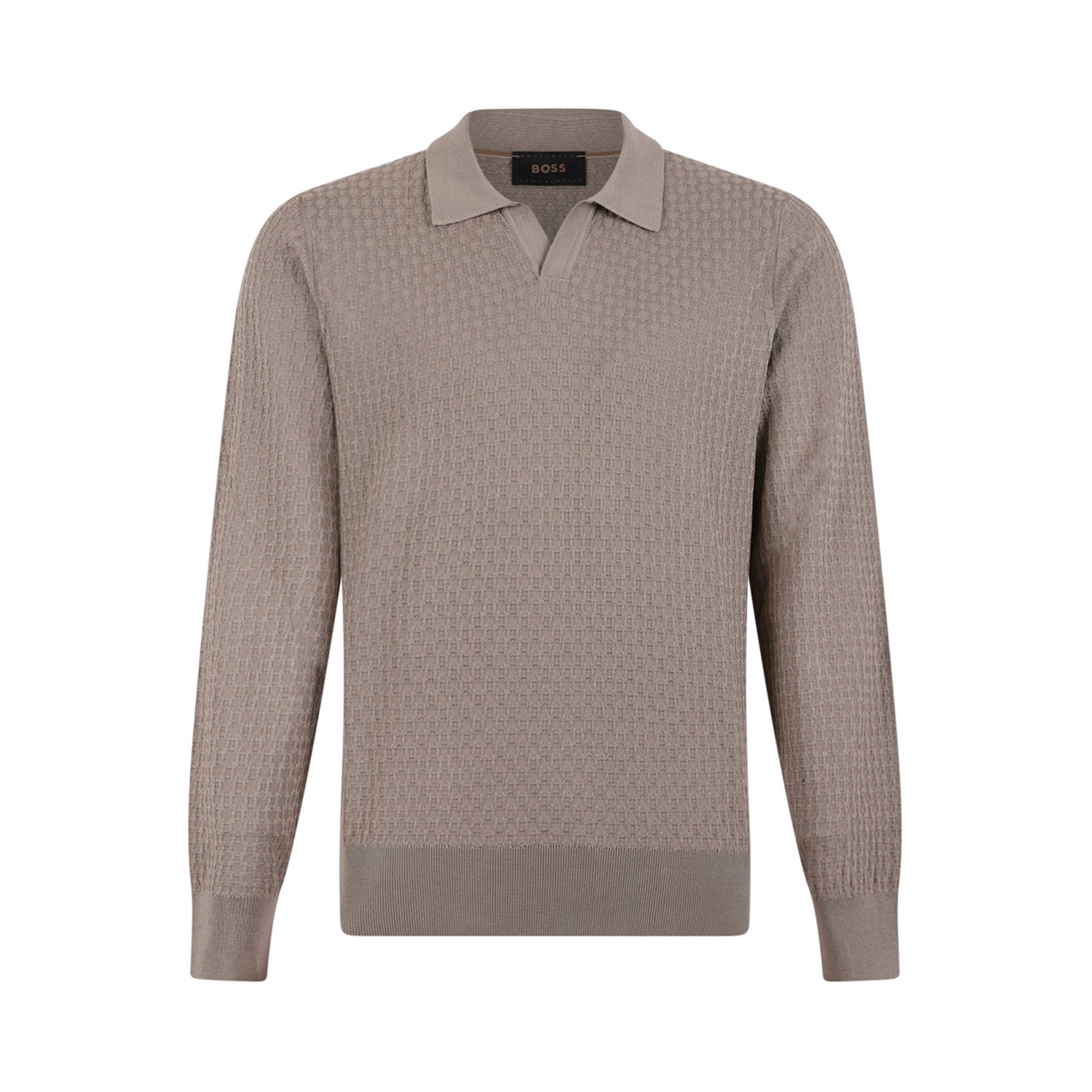 Boss Camel Dark Beige Silk Polo Shirt. Dark beige silk polo shirt with turn down collar, long sleeves.