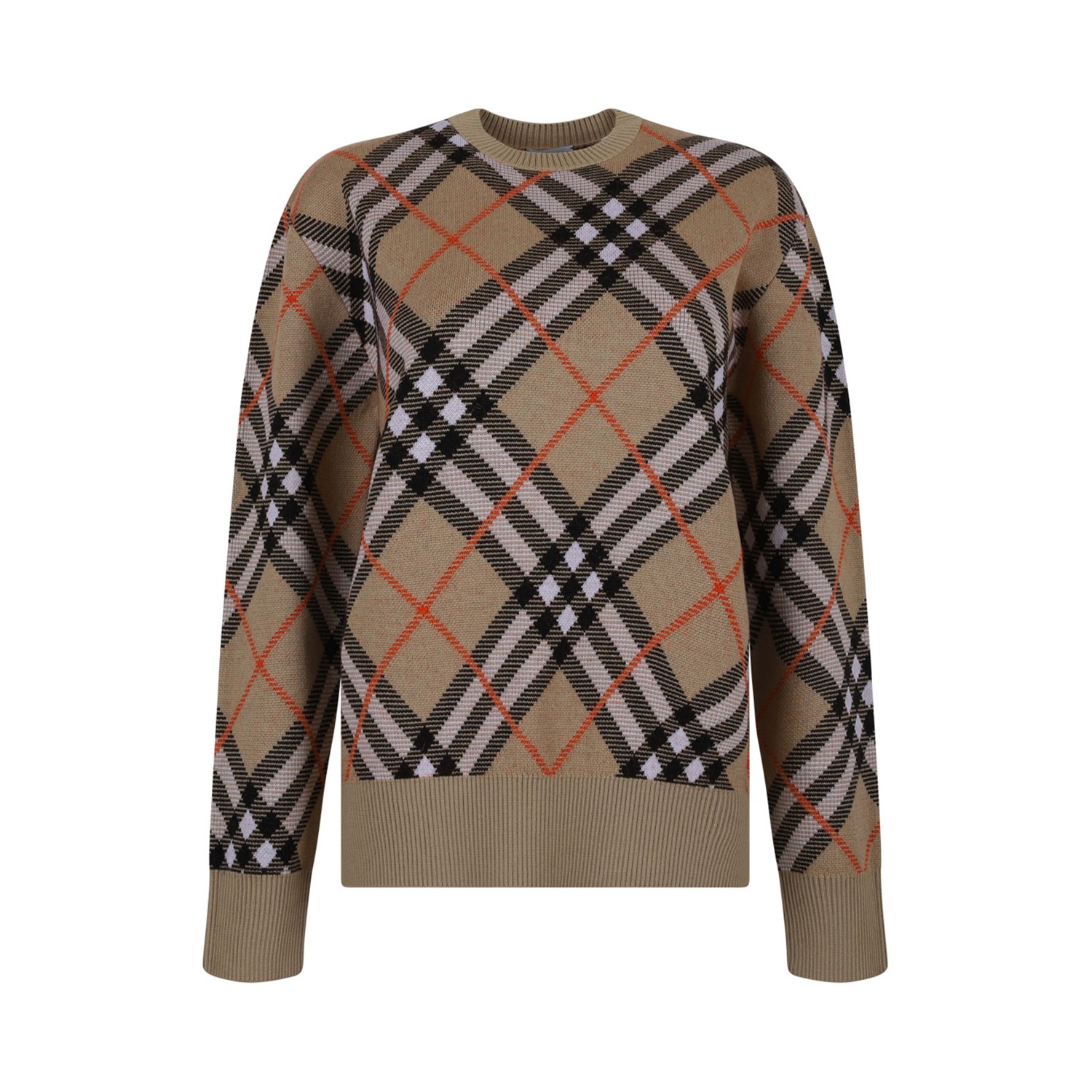 Burberry Vintage Check Jumper. Sand beige and multicolour wool mohair blend jumper, patterned intarsia knit, ribbed knit edge. Vintage Check pattern, crew neck, drop shoulder, long sleeves and straight hem.