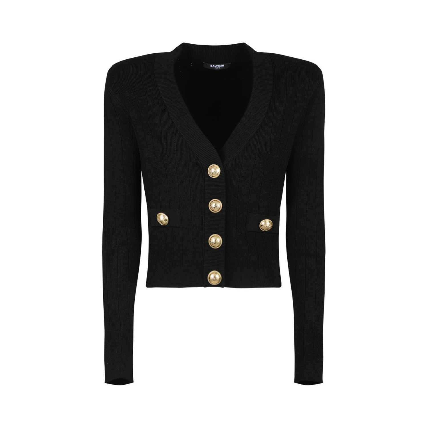 Balmain Black Pointelle Knit Cardigan. Black knitted construction cardigan, embossed gold-tone buttons, plunging V-neck, front button fastening. Shoulder pads, long sleeves, two front patch pockets, ribbed trim, straight hem.
