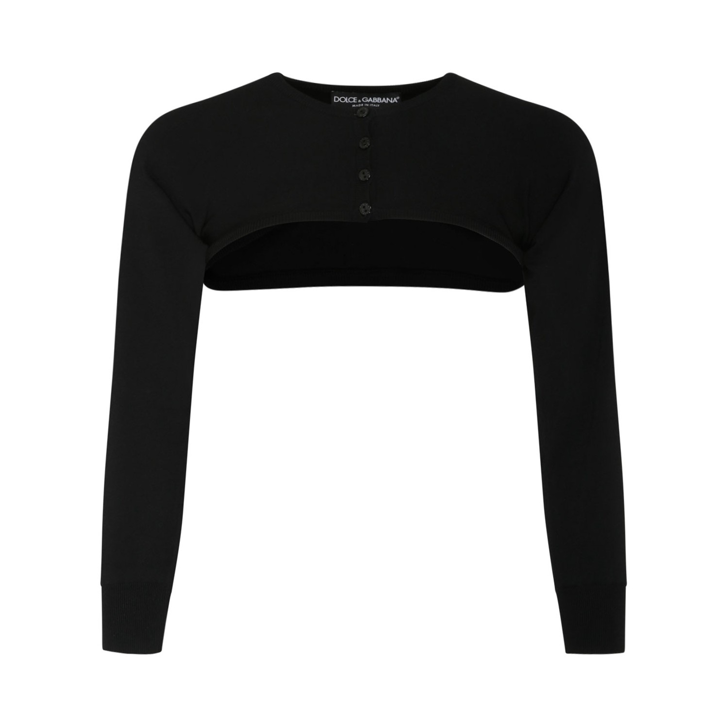 Dolce & Gabbana Black Stretch Design Cropped Cardigan. Black stretch design cardigan, cropped, front button fastening, round neck and long sleeves.
