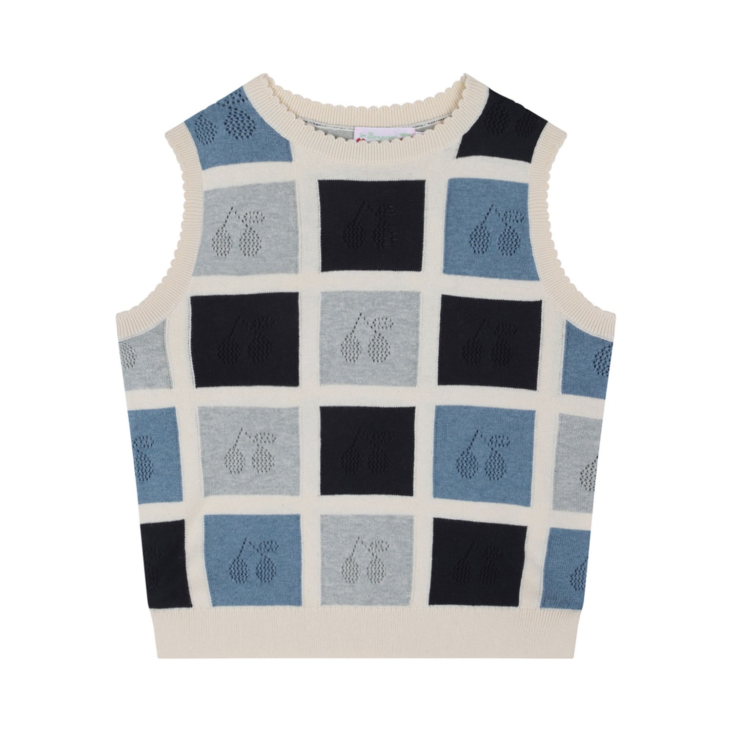 Bonpoint Blue Elda Gilet. Blue cotton and cashmere gilet with plaid check pattern, perforated detailing, crew neck, sleeveless.