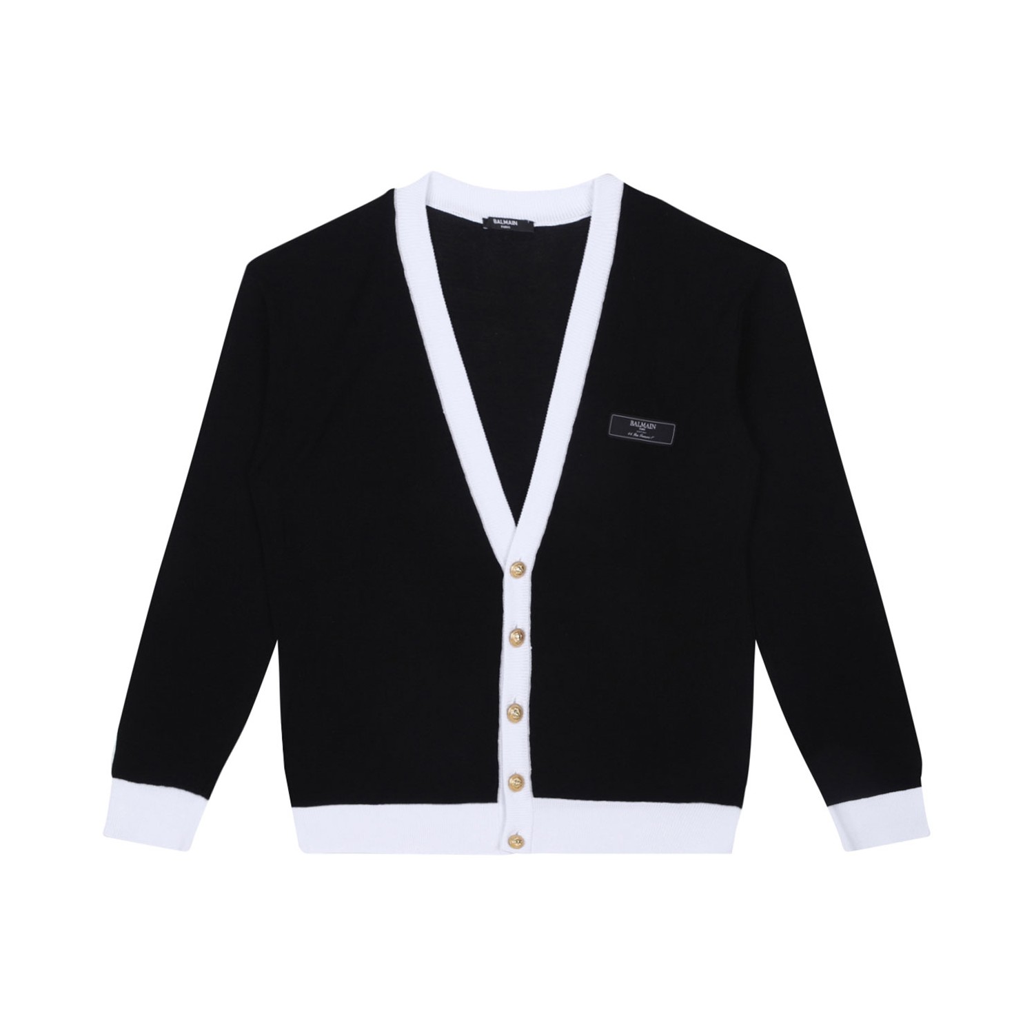 Balmain Kids Black Two Tone Cardigan. Black cotton two tone cardigan with front button fastening, V-neck, contrasting trim, logo patch at the chest.