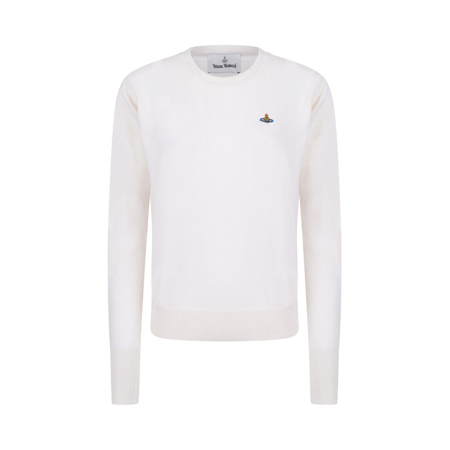 Vivienne Westwood White Orb Embroidered Jumper. White fine knit jumper, crew neck, signature Orb logo embroidery, long sleeves, straight hem, ribbed cuffs and hem.