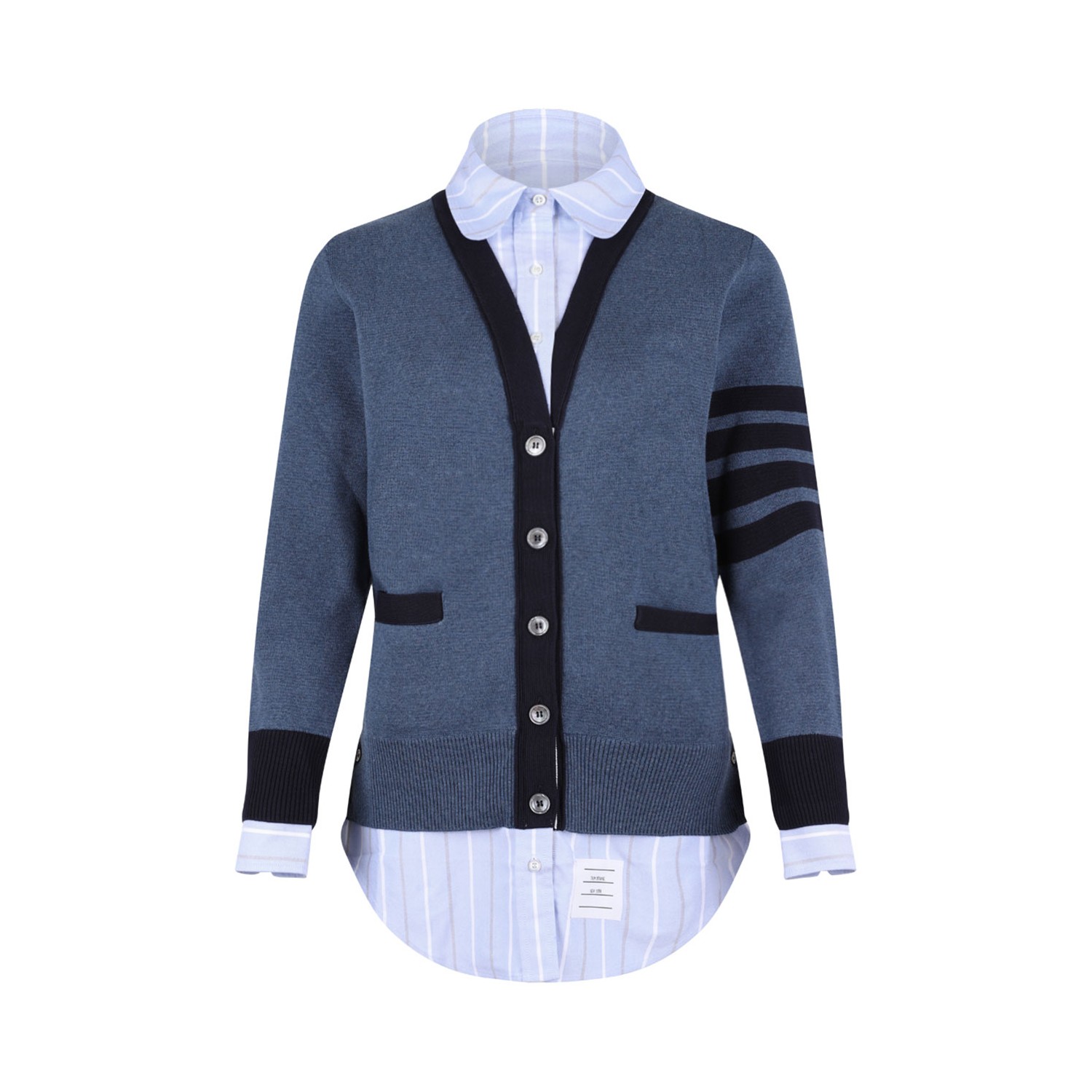 Thom Browne Milano V-Neck Cardigan. Blue and navy blue cotton fine knit side cardigan with stripe detailing, tonal design. Long sleeves, V-neck, front button fastening. Straight hem, two side pouch pockets.