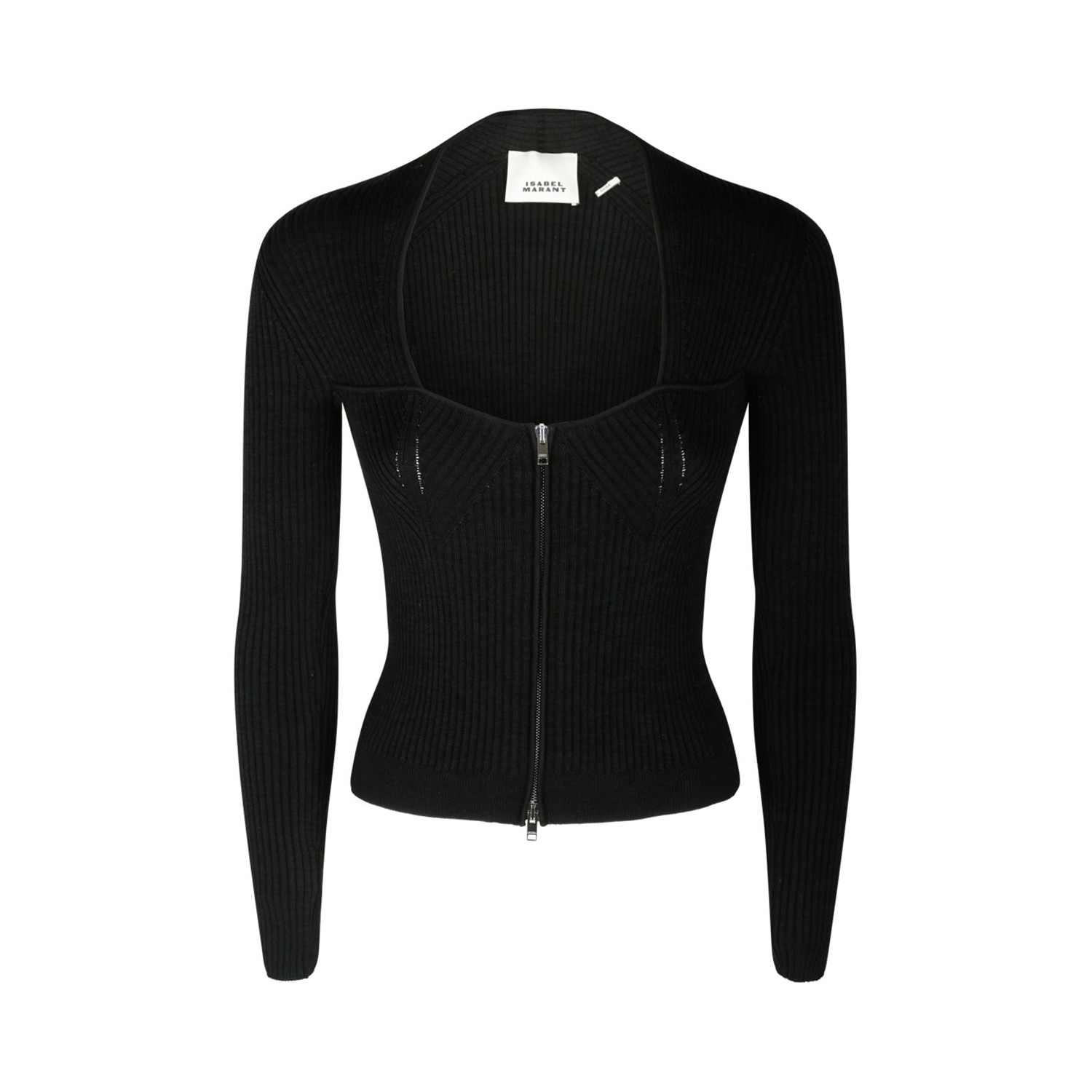 Isabel Marant Black Merino Wool Blend Cardigan. Black merino wool blend cardigan, ribbed knit, scoop neck, front zip fastening, long sleeves and straight hem.