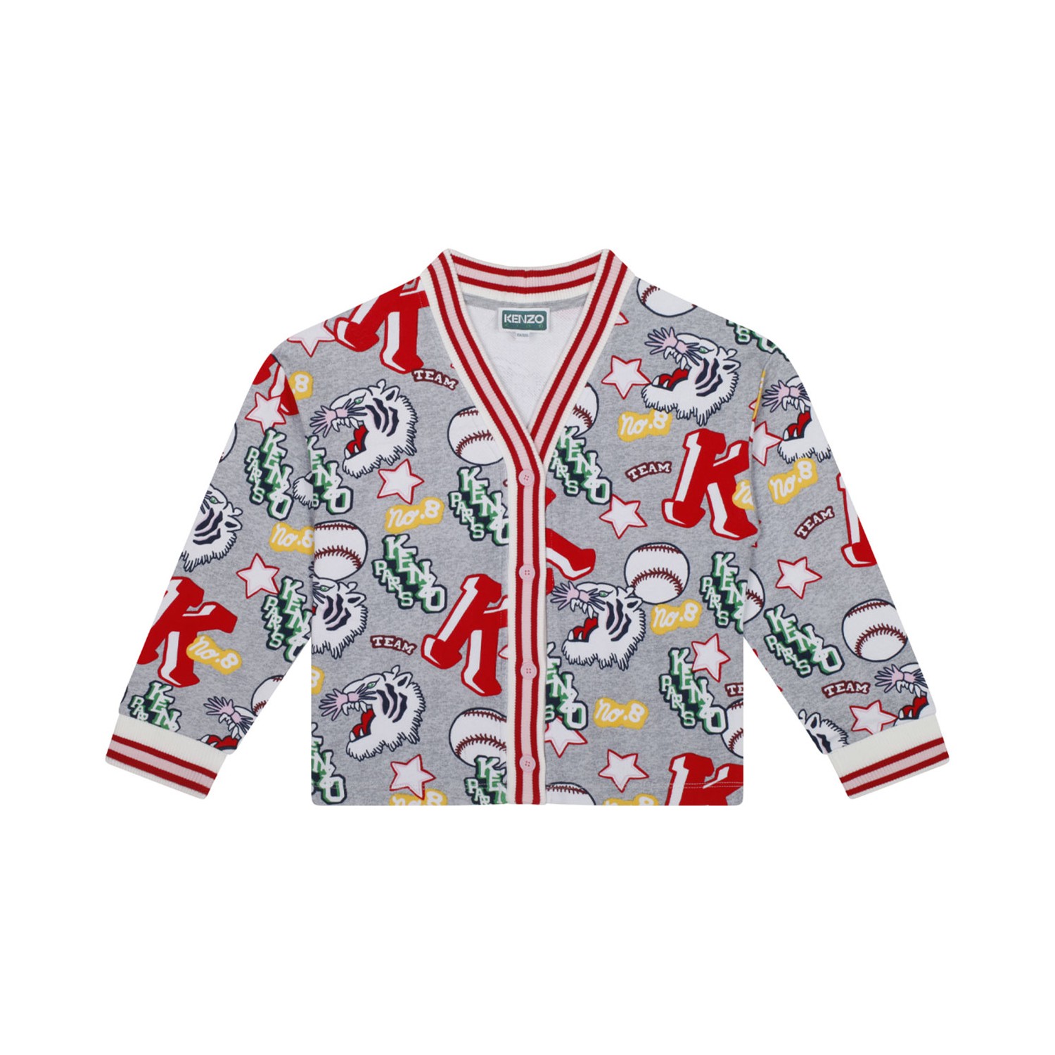 Kenzo Kids Light Grey and Multicolour Graphic Print Cardigan. Light grey and multicolour cotton cardigan, all over graphic print, striped border, V neck, front button fastening, long sleeves and ribbed cuffs.