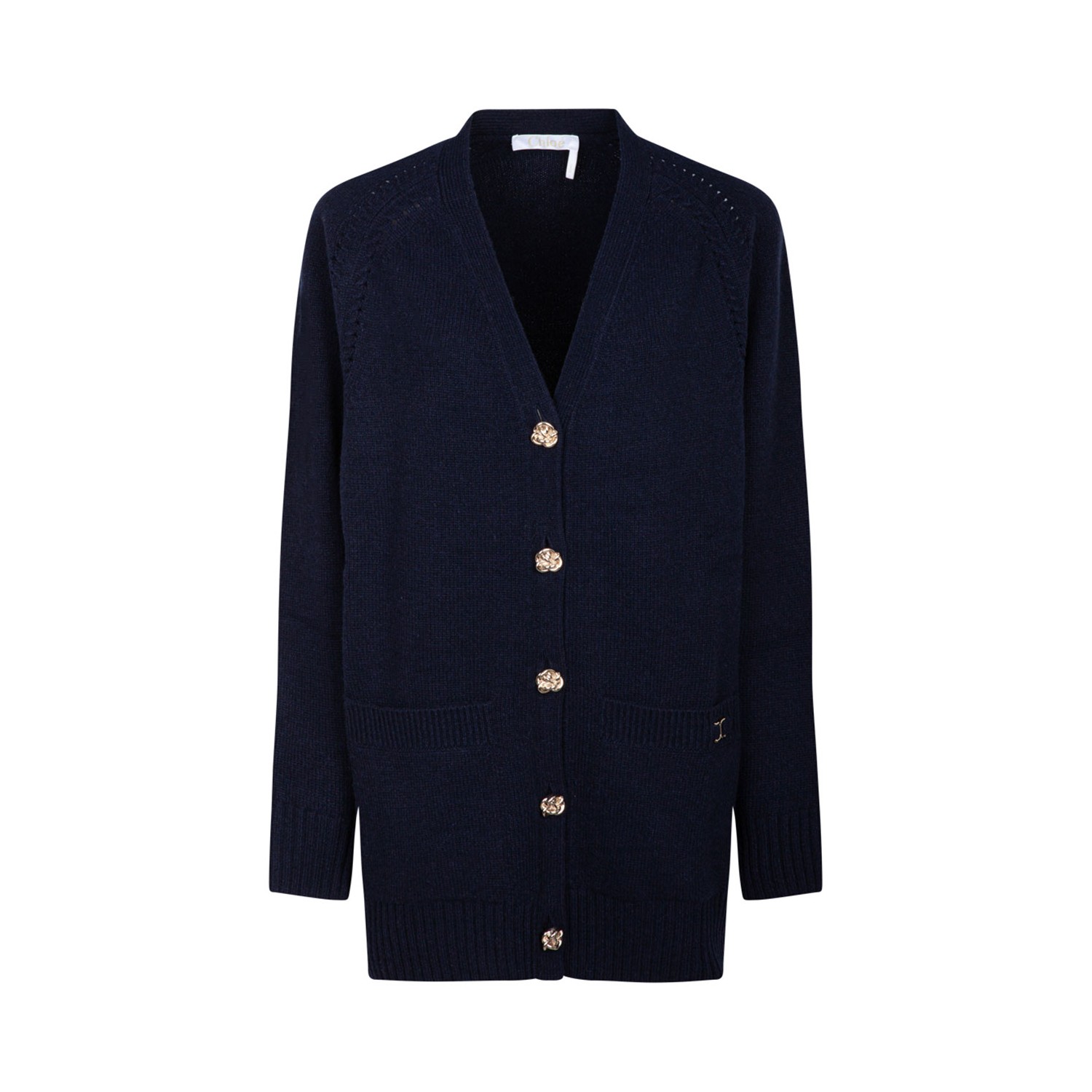 Chloe Navy Blue Cardigan. Navy blue cashmere cardigan, closure with metal buttons, long sleeve, front pockets.