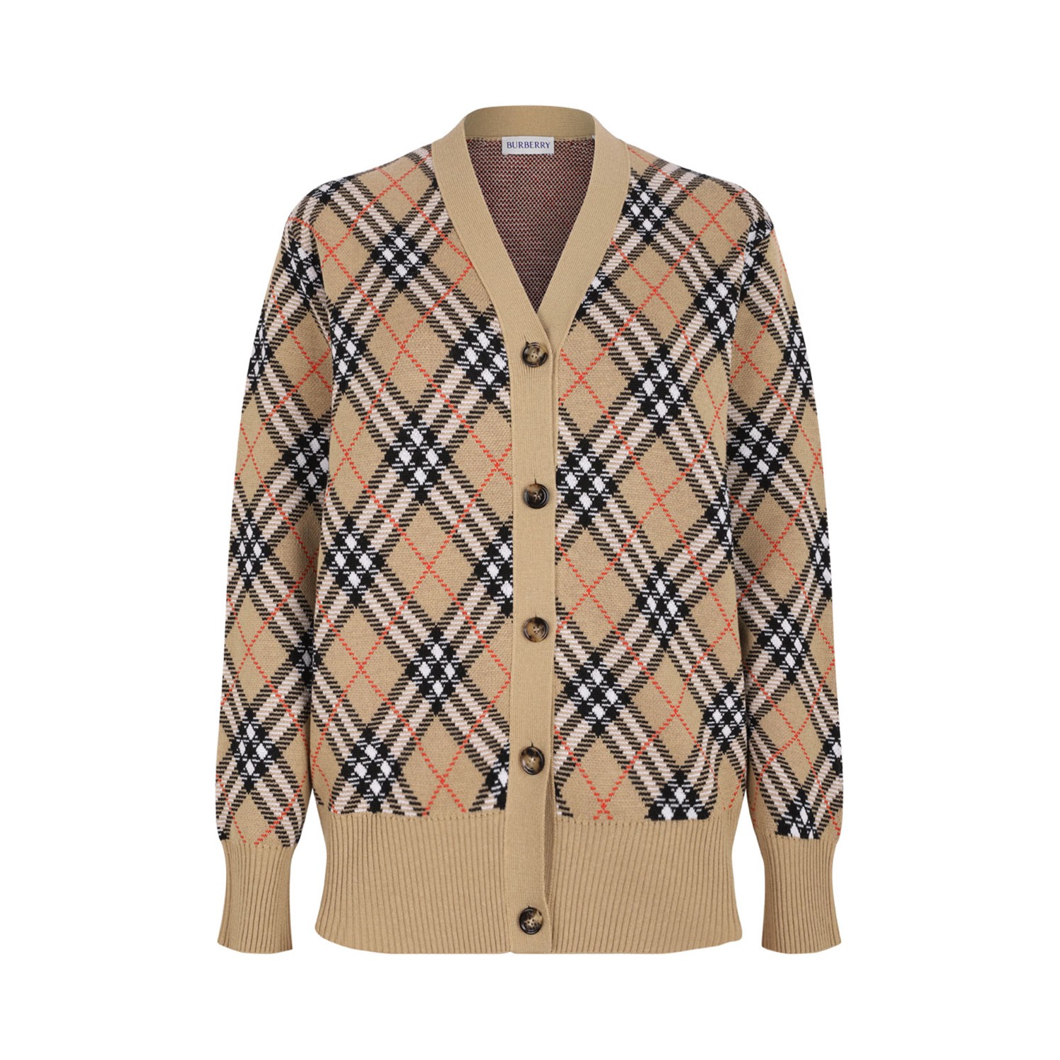 Burberry Cardigan In Wool and Mohair Blend Check. Sand check wool and mohair blend cardigan with V neck, front button fastening and long sleeves.