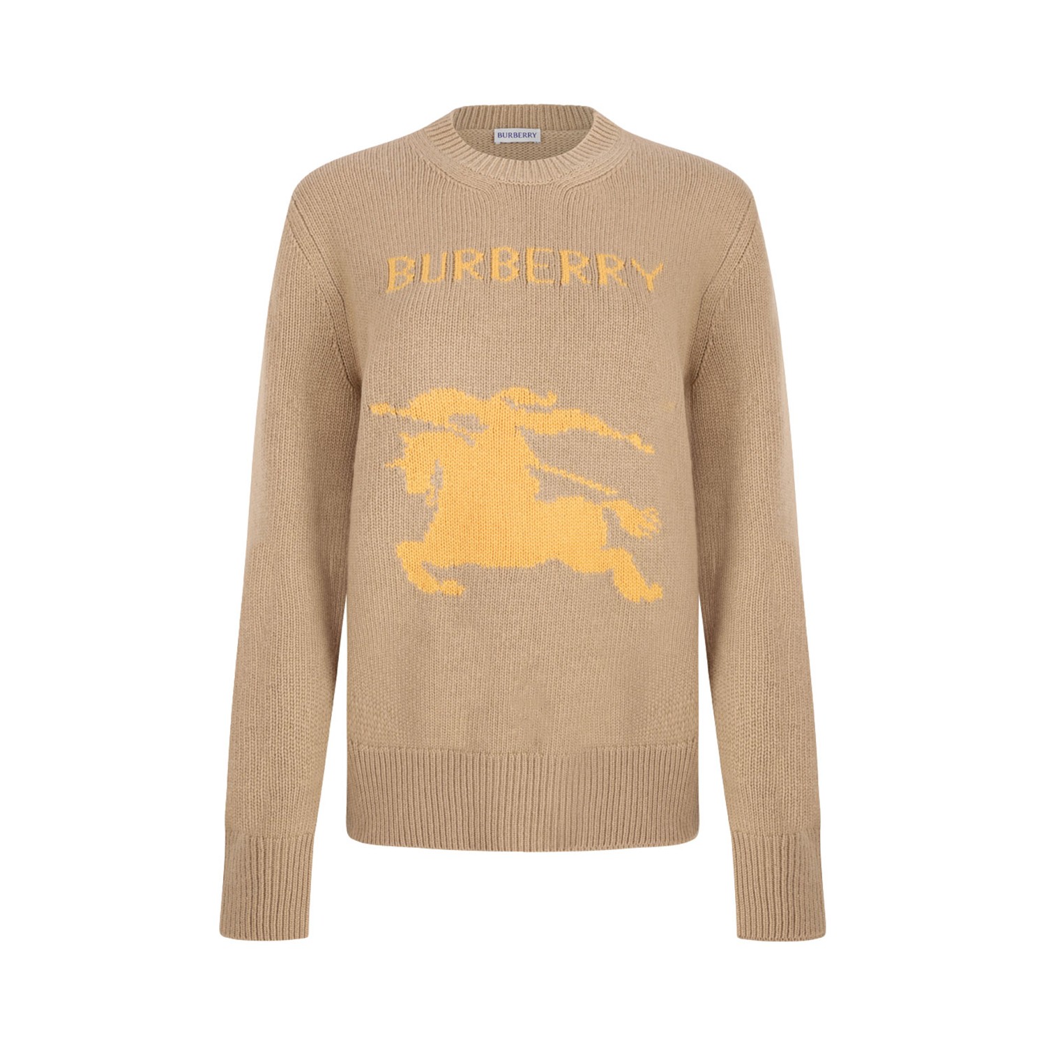 Burberry Equestrian Knight Jumper. Beige wool and cashmere blend jumper with intarsia-knit logo, round neck, long sleeves and straight hem.