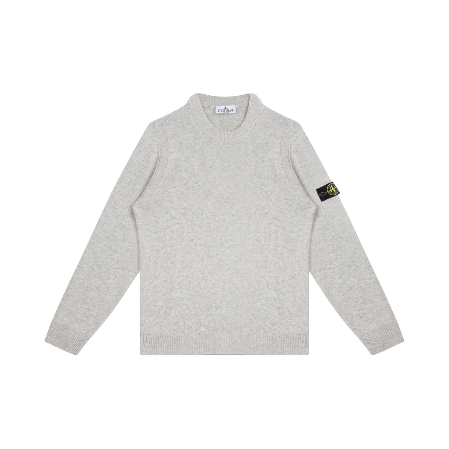 Stone Island Junior Melange Grey Compass-Patch Jumper. Melange grey virgin wool jumper with compass-patch, crew neck, ribbed cuffs and hem, long sleeves.