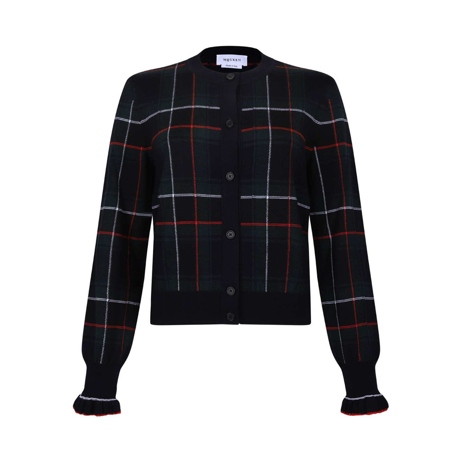 Alexander McQueen Navy Blue, Green and Red Wool Tartan Cardigan. Navy blue, green, and red wool tartan cardigan. Elasticated crew neck and ruffled cuffs. Front button closure.