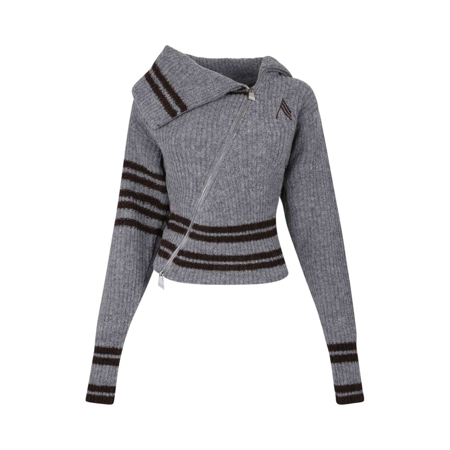 The Attico Melange Grey Striped Zip Front Cardigan. Melange grey geometric jacquard wool mix cardigan with striped sleeves, striped hem and asymmetrical zip fastening.