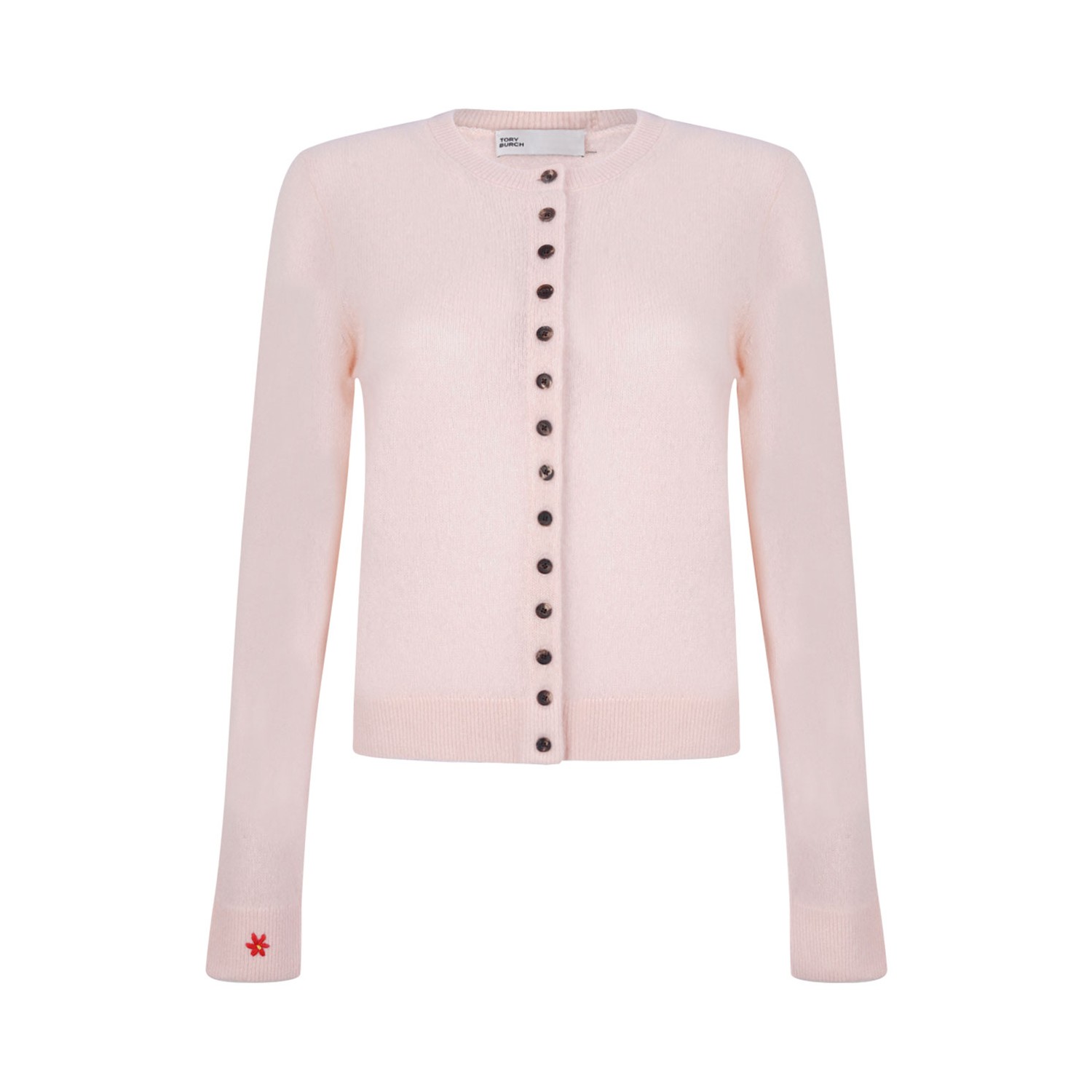Tory Burch Pastel Pink Cashmere Blend Cardigan. Pastel pink cashmere blend cardigan with front button closure, ribbed crew neck, cuffs and hem.