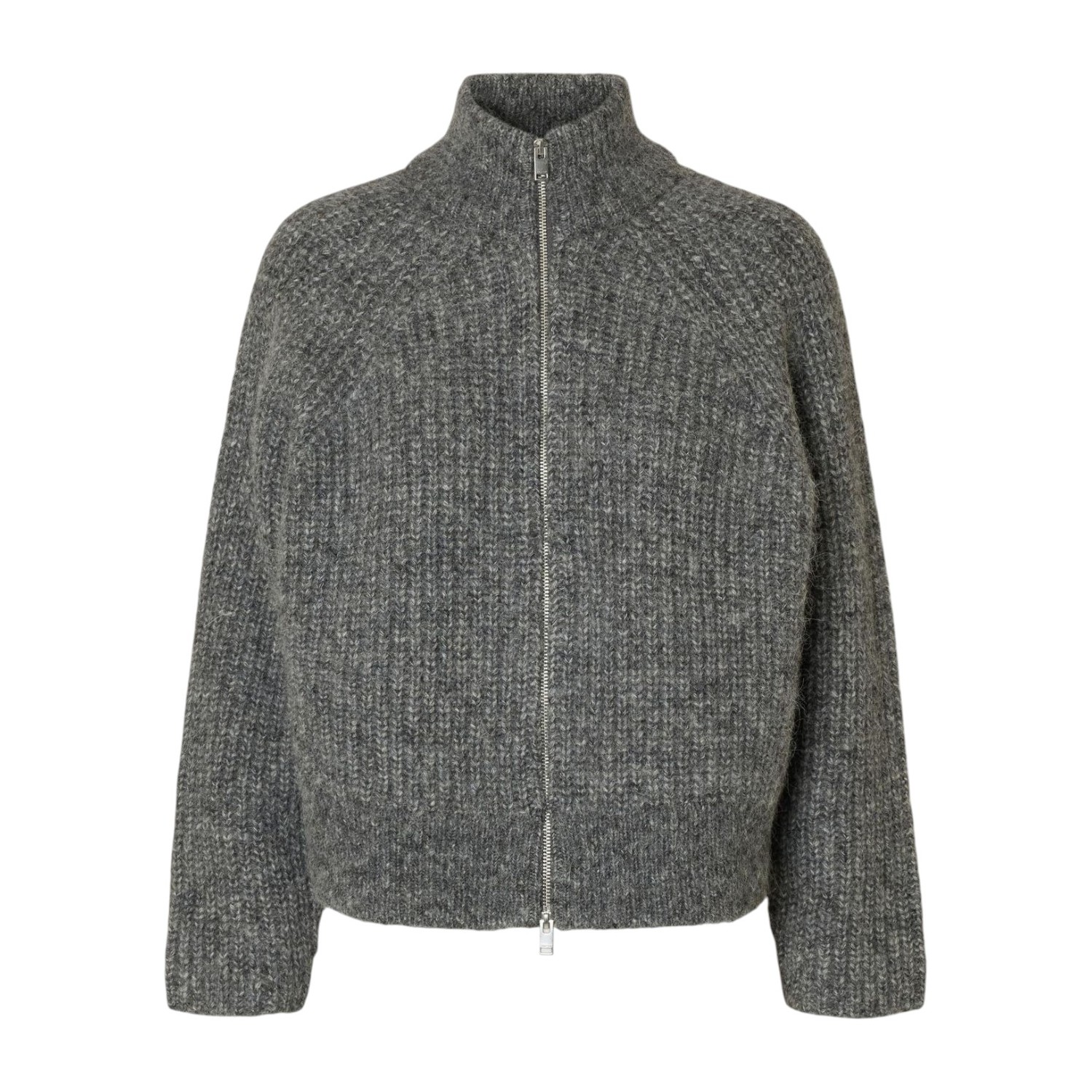 Selected Medium Grey Melange Cardigan With Front Zip. Medium grey melange cardigan with high neck, two way zip up front, long raglan sleeves.