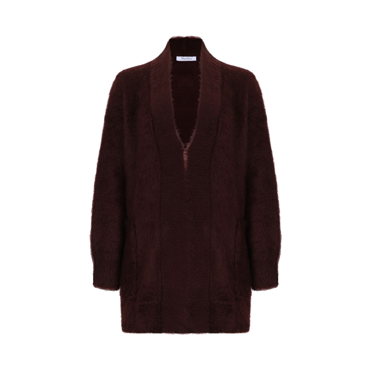 Max Mara Cherry Open Midi Cardigan With A Brushed Finish. Cherry open midi cardigan with a brushed finish, designed for a comfortable and cozy fit. Cardigan in shaved mohair yarn, linea oversize, long sleeves with low set-in. Patch pockets on the front and ribbed cuffs and hem.