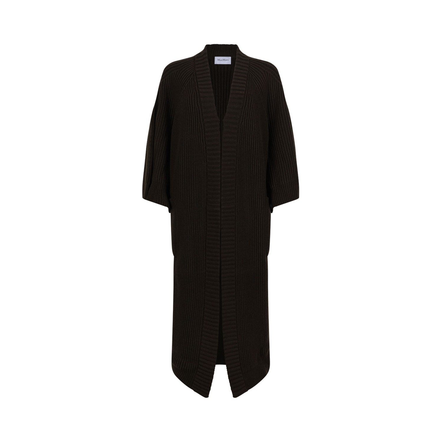 Max Mara Moss Green Long Dressing Gown Cardigan. Moss green cardigan in wool and cashmere yarn with English rib knit, loose fit. 3/4 sleeves with open cut under the sleeves, patch pockets on the sides and ribbed edges.