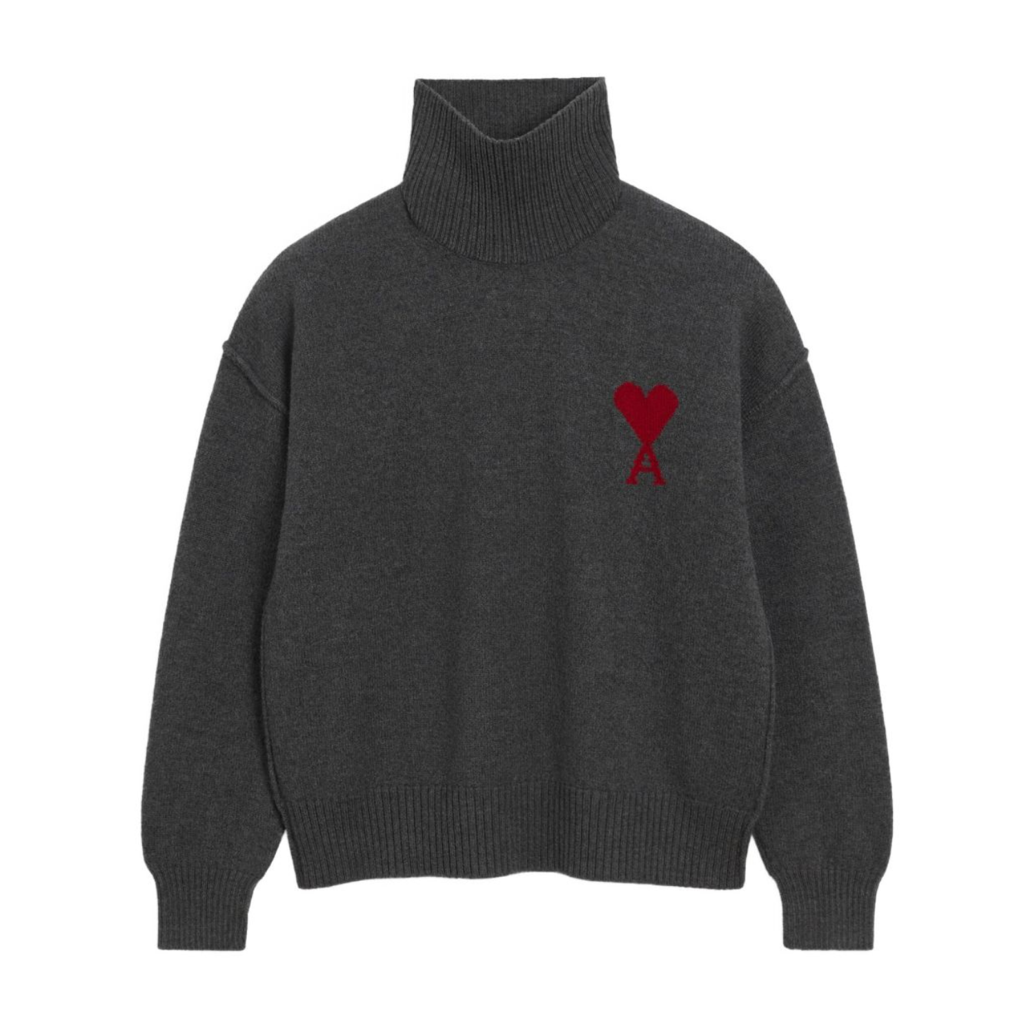 Ami Grey Wool Ami De Coeur Funnel Neck Sweater. Grey sweater in felted merino wool knit, funnel neck, intarsia knitted Ami de Coeur on the chest. Jersey stitch and inside out seams.