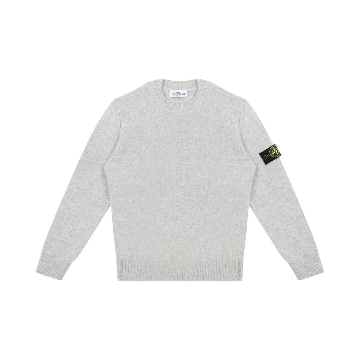 Stone Island Junior Melange Grey Compass-Patch Jumper. Melange grey virgin wool jumper with compass-patch, crew neck, ribbed cuffs and hem, long sleeves.