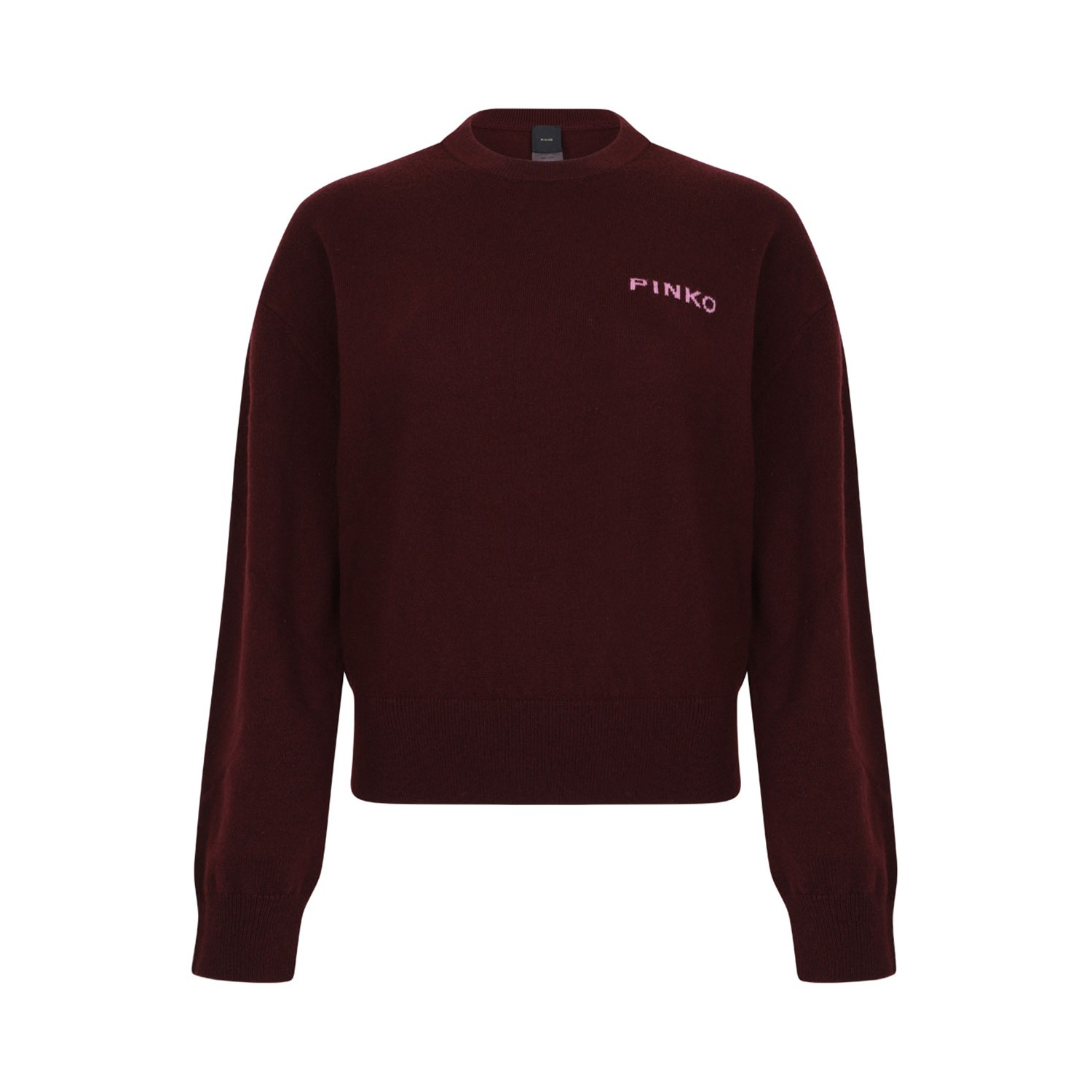 Pinko Burgundy Wool Logo Embellished Knit Sweater. Burgundy wool blend sweater with bird motif, crew neck, long sleeves and ribbed hem.