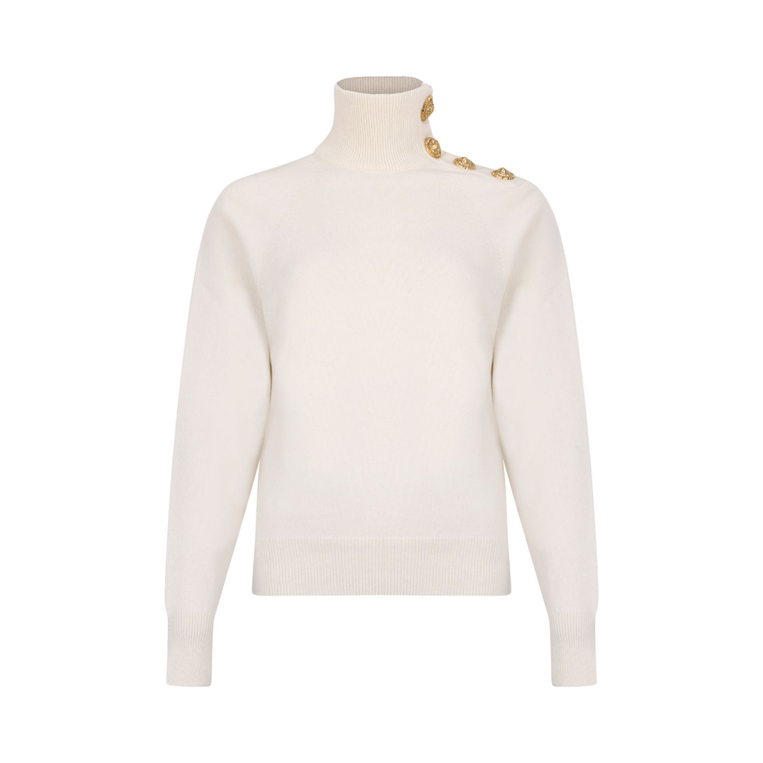 Balmain Off White High-Neck Coin-Button Sweater. Off white cashmere and virgin wool sweater with high neck, long sleeves, ribbed cuffs, coin buttons and raglan sleeves.