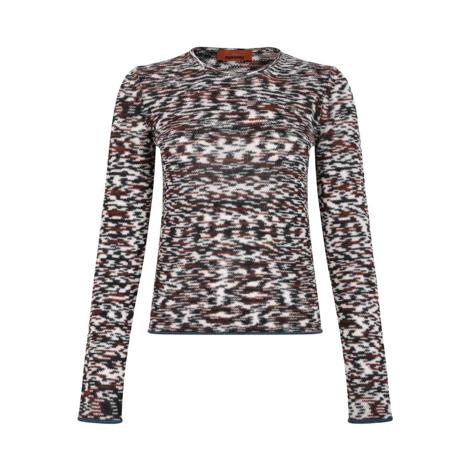 Missoni Black and Brown Crew Neck Sweater With Flame Pattern. Black and brown cashmere and wool blend sweater with crew neck, long-sleeve and flame plain knit.