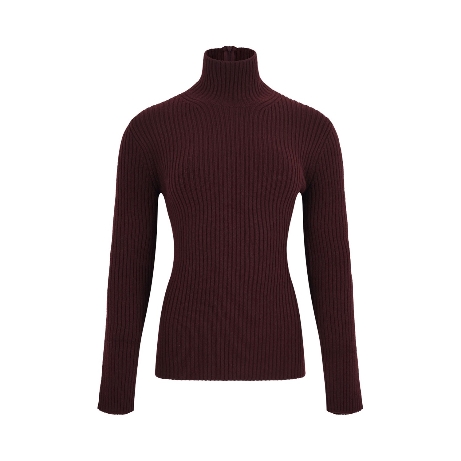 Max Mara Cherry Ribbed Wool And Cashmere Turtleneck. Turtleneck sweater featuring a ribbed finish that highlights the silhouette. Fitted line, high neck, long sleeves. Half zip on the back of the neck with personalized enamel slider.