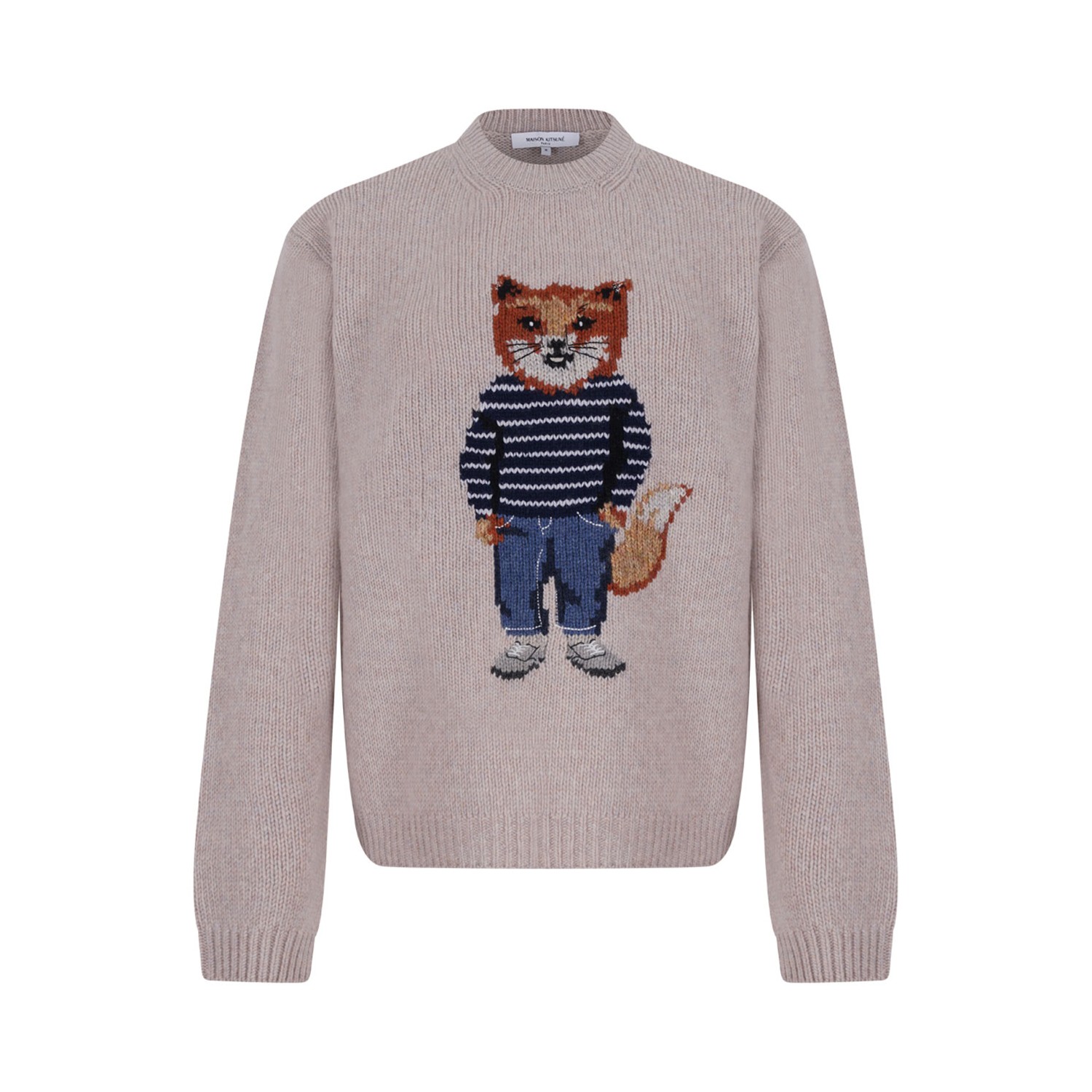 Maison Kitsune Long-Sleeved Superfine Merino Wool Sweater. White knitwear parchment with crew neck, long sleeves. Ribbed trim on collar, cuffs and hem. Intarsia flower arrangement and intarsia "Dressed Fox" pattern on chest.