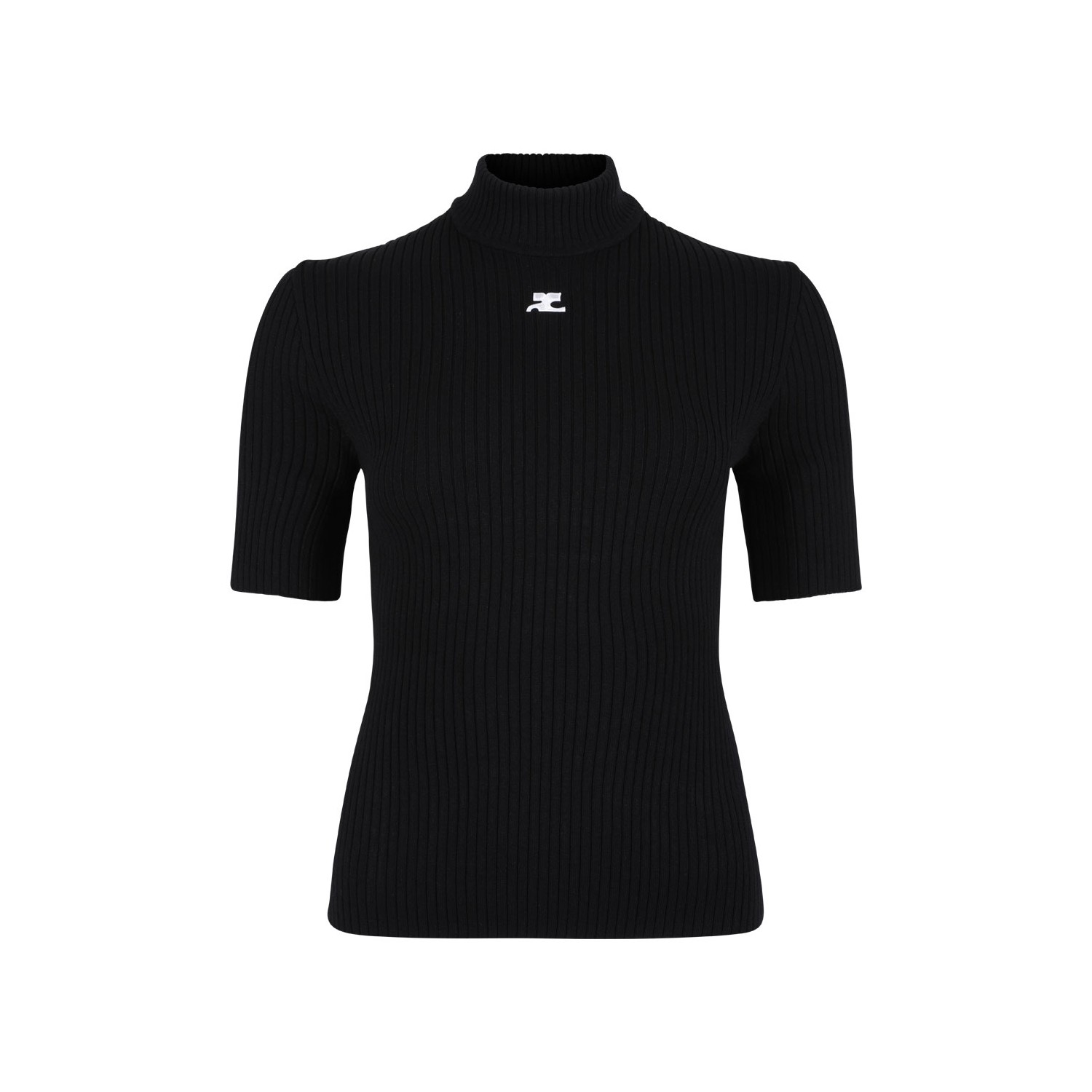 Courreges Black Reedition Rib Knit Sweater. Black knitted construction top with logo print to the front, round neck and short sleeves.