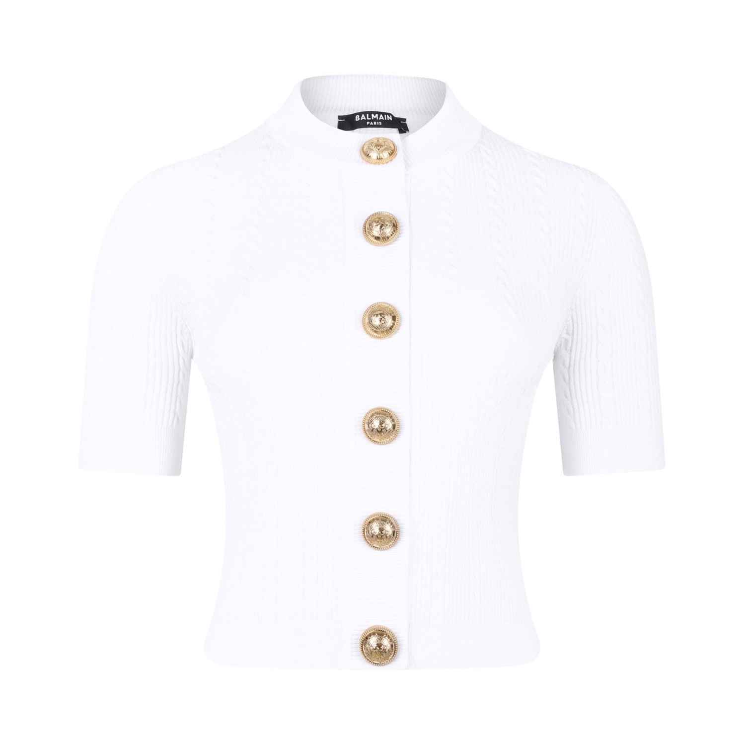 Balmain White Knit Button-Up Top.White ribbed stretch-knit top with a fitted silhouette and short sleeves. Features a high round collar and signature gold-tone embossed buttons running down the front. Textured vertical detailing adds structure, while the cropped cut enhances its modern elegance. A refined yet bold piece, true to Balmain