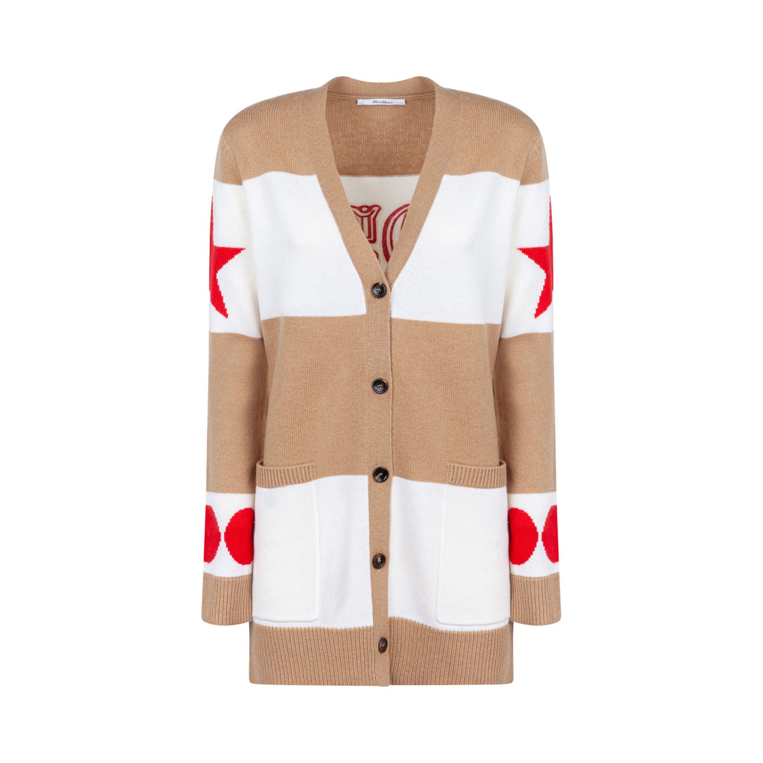 Max Mara Valido Long Cardigan. Long cardigan with oversized volume, made of a fine blend of wool and cashmere in plain stitch. The model is personalized with jacquard stripes, placed designs and contrasting 1951 detail, with a characteristic flocked texture, applied on the back. Complete with patch pockets on the front, V-neck and ribbed edges. Front closure with visible buttons.