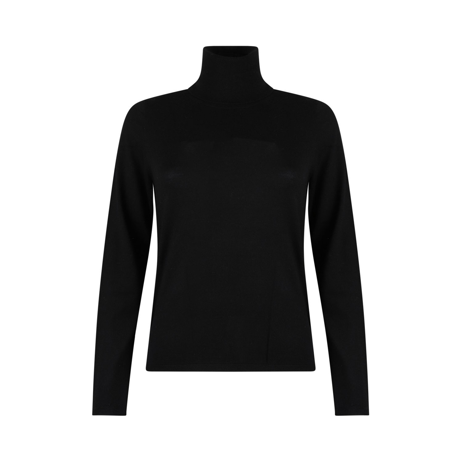 Max Mara Black Turtleneck Sweater. Black fine and lightweight pure cashmere yarn sweater, seamless model, characterized by a fitted silhouette, high neck and long sleeves. Finished with ribbed edges. Zip closure on the back of the neck.