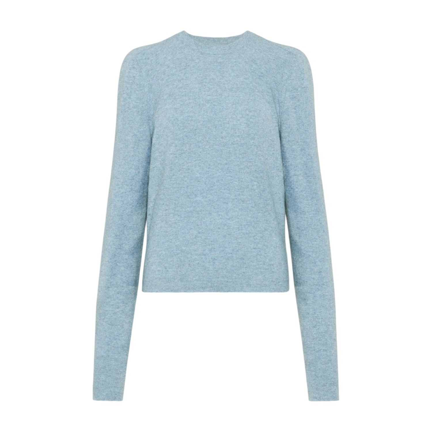 Maison Margiela Blue Wool Knit Top. Blue wool knit top with crew neck, raised seams at shoulder. Ribbed cuffs and hem, four stitches at the back.