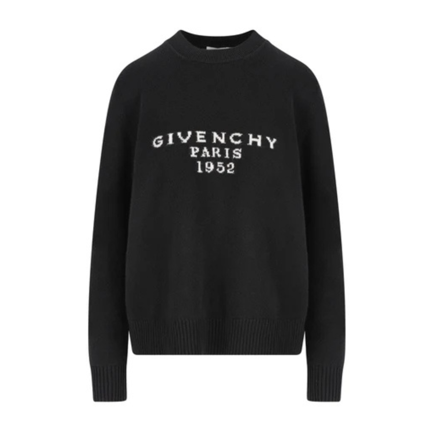 Givenchy Black Sweater In Wool Cashmere With Givenchy Signature. Black long-sleeved sweater in wool and cashmere with crew neck, Givenchy Paris 1952 jacquard on the front. Ribbed collar hem and cuffs.