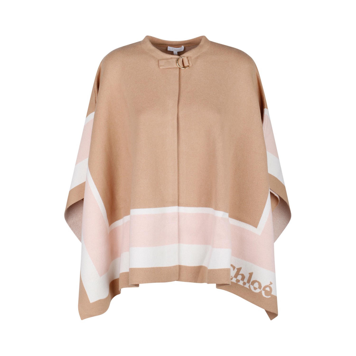 Chloe Kids Sand Logo Cape. Sand wool and cotton blend cape, stripe detail, crew neck, buckle closure, long sleeves and asymmetric hem.