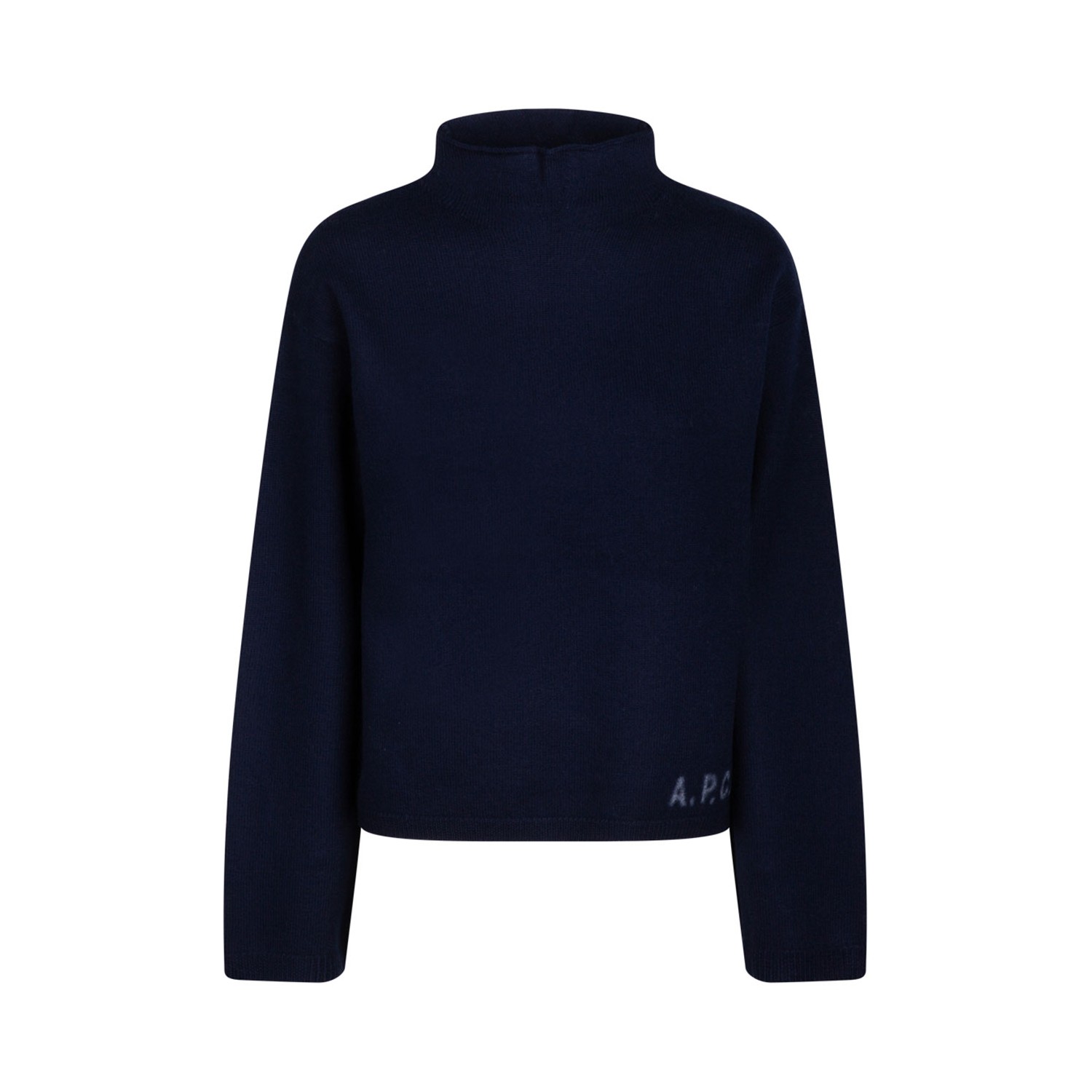 A.P.C. Navy Blue Wool Jumper. Navy blue virgin wool jumper, logo print to the side, funnel neck, long sleeves. Ribbed cuffs and hem, straight hem.