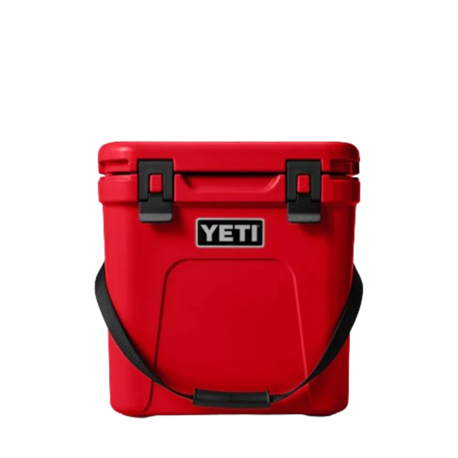 Yeti Rescure Red Roadie 24 Cool Box. Rescure red made for the road and ready to go – The Roadie® 24 Cool Box packs more while taking up less space. It’s built tall to accommodate critical bottles of wine and slim enough to squeeze behind the driver’s or passenger’s seat of a car.