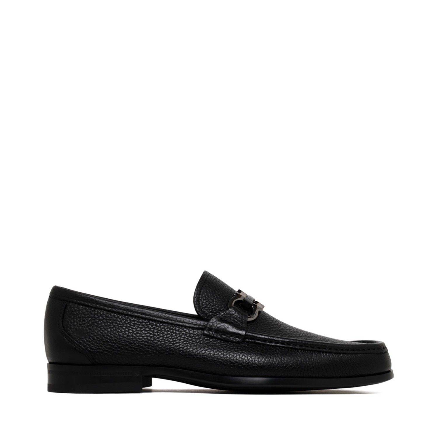 Ferragamo Classic Black Calfskin Loafer with metallic ornament and patent leather band. In tubular workmanship with rubber sole. Hand-stitched upper.