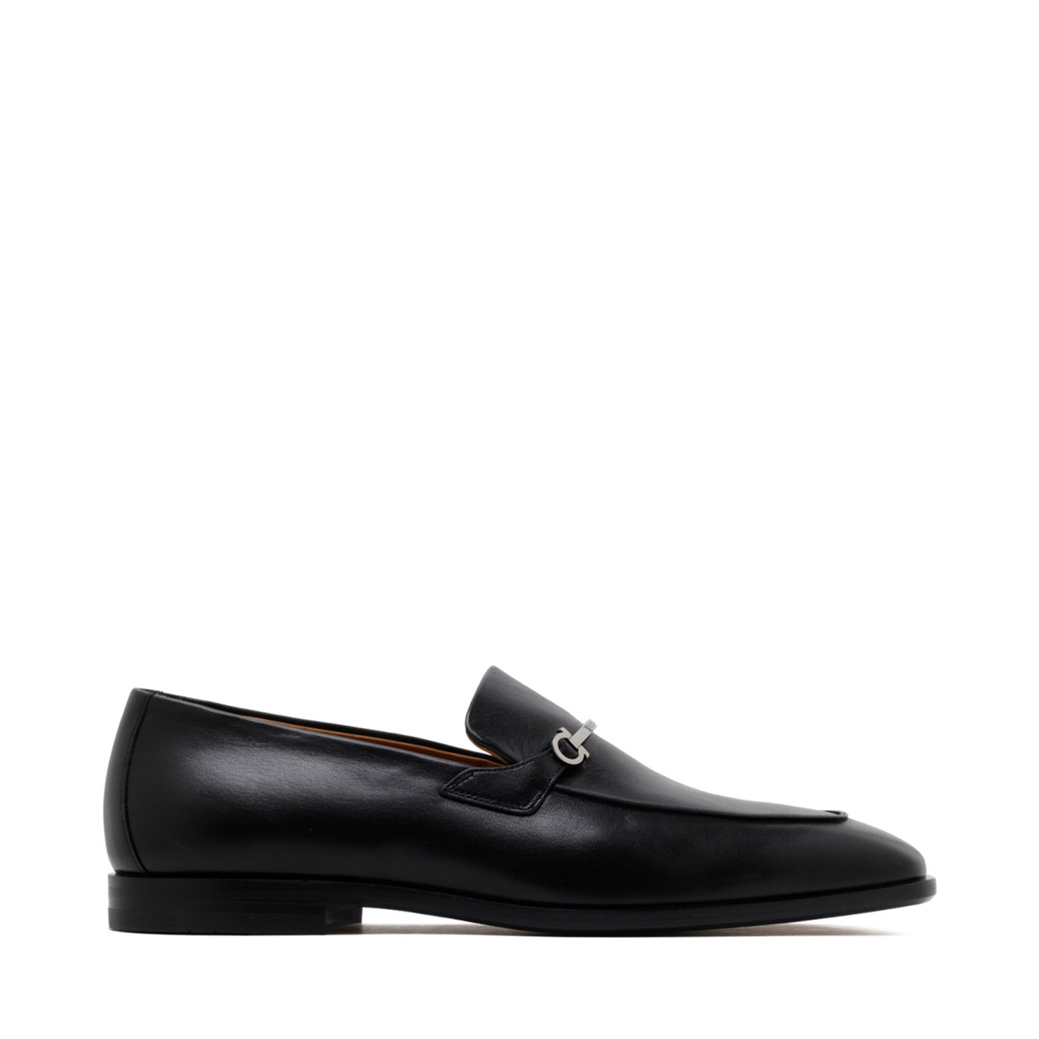 Ferragamo Black Loafers with soft leather upper. Square toe line. Cross-bar decorated with metallic ornament with side hooks typical of the brand. Thin leather sole with rubber heel.