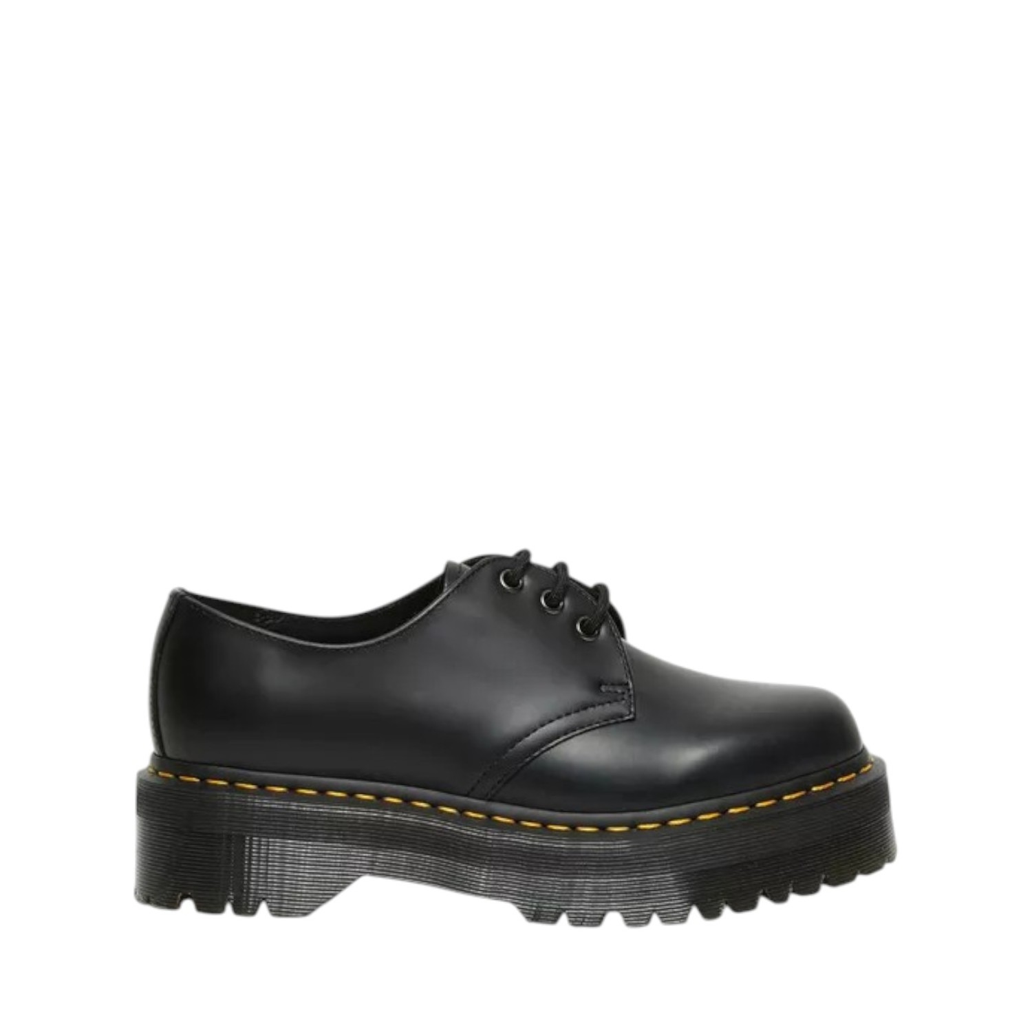 Dr. Martens Black 1461 Quad Leather Platform Shoes. Black classic 1461 shoe reaches new heights. Built on our highest platform sole, the 1461 Quad has undergone a complete makeover, crafted from Polished Smooth leather and featuring signature yellow welt stitching and an AirWair heel loop.